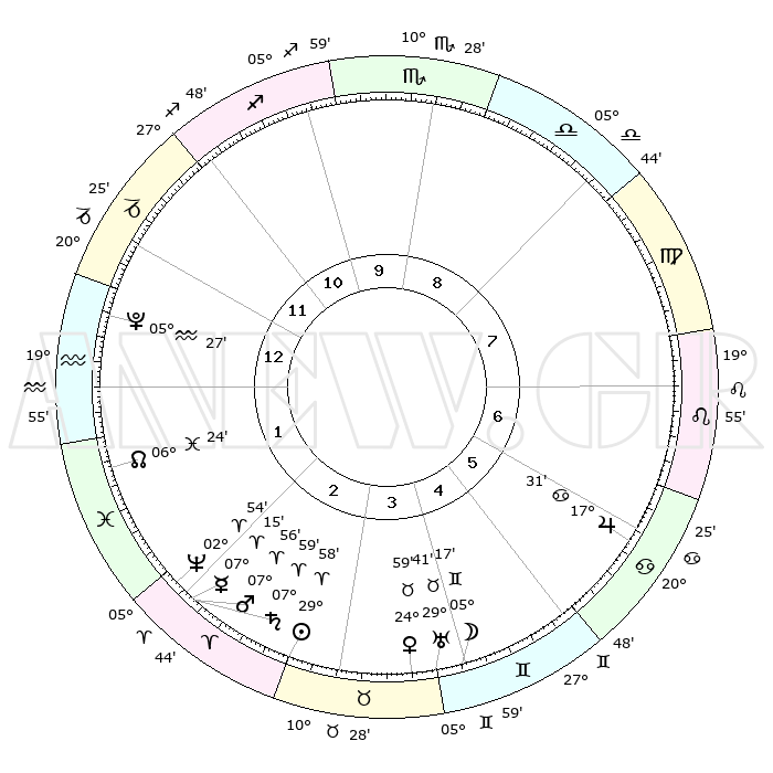 | | ΘΕΣΕΙΣ ΠΛΑΝΗΤΩΝ ΑΣΤΡΟΛΟΓΙΚΟΥ ΧΑΡΤΗ ΤΗΣ ΣΤΙΓΜΗΣ ΑΥΤΗΣ | | | | Πλανήτης | Ζώδιο | Μοίρες | Δεκαήμ. | Σε οίκο | Απόκλιση | | Ακμές των οίκων | | Ηλιος | Κριός | 29°55' | Τρίτο | 3 | 11 N 26 | | 1ος | 24°46' | Αιγόκερως | | Σελήνη | Δίδυμοι | 04°28' | Πρώτο | 4 | 26 N 02 | | 2ος | 07°55' | Ιχθείς | | Ερμής | Κριός | 07°10' | Πρώτο | 2 | 00 N 26 | | 3ος | 17°06' | Κριός | | Αφροδίτη | Ταύρος | 24°54' | Τρίτο | 4 | 19 N 23 | | 4ος | 16°30' | Ταύρος | | Αρης | Κριός | 07°54' | Πρώτο | 2 | 02 N 15 | | 5ος | 09°41' | Δίδυμοι | | Δίας | Καρκίνος | 17°31' | Δεύτερο | 6 | 22 N 40 | | 6ος | 00°58' | Καρκίνος | | Κρόνος | Κριός | 07°59' | Πρώτο | 2 | 01 N 11 | | 7ος | 24°46' | Καρκίνος | | Ουρανός | Ταύρος | 29°41' | Τρίτο | 4 | 19 N 55 | | 8ος | 07°55' | Παρθένος | | Ποσειδώνας | Κριός | 02°54' | Πρώτο | 2 | 00 S 03 | | 9ος | 17°06' | Ζυγός | | Πλούτωνας | Υδροχόος | 05°27' | Πρώτο | 1 | 22 S 48 | | 10ος | 16°30' | Σκορπιός | | Β. Δεσμός | Ιχθείς | 06°24' | Πρώτο | 1 | 09 S 10 | | 11ος | 09°41' | Τοξότης | | Ωροσκόπος | Αιγόκερως | 24°46' | Τρίτο | | | 12ος | 00°58' | Αιγόκερως | | Μεσουράνημα | Σκορπιός | 16°30' | Δεύτερο | | | |
