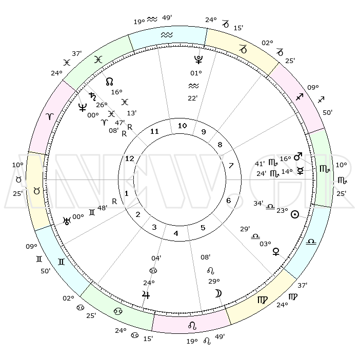 | ΘΕΣΕΙΣ ΠΛΑΝΗΤΩΝ ΑΣΤΡΟΛΟΓΙΚΟΥ ΧΑΡΤΗ ΤΗΣ ΣΤΙΓΜΗΣ ΑΥΤΗΣ | | Πλανήτης | Ζώδιο | Μοίρες | Δεκαήμ. | Σε οίκο | Απόκλιση | | Ακμές των οίκων | Ηλιος | Ζυγός | 23°28' | Τρίτο | 7 | 09 S 07 | | 1ος | 17°54' | Ιχθείς | Σελήνη | Λέων | 27°57' | Τρίτο | 6 | 13 N 51 | | 2ος | 00°50' | Ταύρος | Ερμής | Σκορπιός | 14°16' | Δεύτερο | 8 | 17 S 56 | | 3ος | 00°13' | Δίδυμοι | Αφροδίτη | Ζυγός | 03°22' | Πρώτο | 7 | 00 N 03 | | 4ος | 23°10' | Δίδυμοι | Αρης | Σκορπιός | 16°37' | Δεύτερο | 8 | 17 S 02 | | 5ος | 15°03' | Καρκίνος | Δίας | Καρκίνος | 24°04' | Τρίτο | 5 | 21 N 21 | | 6ος | 10°43' | Λέων | Κρόνος | Ιχθείς | 26°47'R | Τρίτο | 1 | 03 S 34 | | 7ος | 17°54' | Παρθένος | Ουρανός | Δίδυμοι | 00°48'R | Πρώτο | 3 | 20 N 06 | | 8ος | 00°50' | Σκορπιός | Ποσειδώνας | Κριός | 00°08'R | Πρώτο | 1 | 01 S 12 | | 9ος | 00°13' | Τοξότης | Πλούτωνας | Υδροχόος | 01°22' | Πρώτο | 11 | 23 S 32 | | 10ος | 23°10' | Τοξότης | Β. Δεσμός | Ιχθείς | 16°13' | Δεύτερο | 12 | 05 S 26 | | 11ος | 15°03' | Αιγόκερως | Ωροσκόπος | Ιχθείς | 17°54' | Δεύτερο | | | 12ος | 10°43' | Υδροχόος | Μεσουράνημα | Τοξότης | 23°10' | Τρίτο | | | |