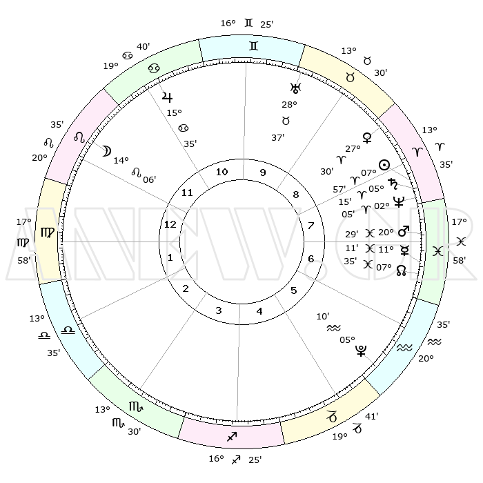 | | ΘΕΣΕΙΣ ΠΛΑΝΗΤΩΝ ΑΣΤΡΟΛΟΓΙΚΟΥ ΧΑΡΤΗ ΤΗΣ ΣΤΙΓΜΗΣ ΑΥΤΗΣ | | | | Πλανήτης | Ζώδιο | Μοίρες | Δεκαήμ. | Σε οίκο | Απόκλιση | | Ακμές των οίκων | | Ηλιος | Κριός | 07°53' | Πρώτο | 8 | 03 N 08 | | 1ος | 00°53' | Παρθένος | | Σελήνη | Λέων | 13°18' | Δεύτερο | 12 | 18 N 59 | | 2ος | 24°50' | Παρθένος | | Ερμής | Ιχθείς | 11°09' | Δεύτερο | 7 | 08 S 03 | | 3ος | 23°35' | Ζυγός | | Αφροδίτη | Κριός | 27°25' | Τρίτο | 9 | 10 N 01 | | 4ος | 26°30' | Σκορπιός | | Αρης | Ιχθείς | 20°26' | Τρίτο | 7 | 04 S 45 | | 5ος | 00°38' | Αιγόκερως | | Δίας | Καρκίνος | 15°34' | Δεύτερο | 11 | 22 N 53 | | 6ος | 02°31' | Υδροχόος | | Κρόνος | Κριός | 05°14' | Πρώτο | 8 | 00 N 08 | | 7ος | 00°53' | Ιχθείς | | Ουρανός | Ταύρος | 28°37' | Τρίτο | 10 | 19 N 41 | | 8ος | 24°50' | Ιχθείς | | Ποσειδώνας | Κριός | 02°05' | Πρώτο | 8 | 00 S 22 | | 9ος | 23°35' | Κριός | | Πλούτωνας | Υδροχόος | 05°10' | Πρώτο | 6 | 22 S 48 | | 10ος | 26°30' | Ταύρος | | Β. Δεσμός | Ιχθείς | 07°35' | Πρώτο | 7 | 08 S 43 | | 11ος | 00°38' | Καρκίνος | | Ωροσκόπος | Παρθένος | 00°53' | Πρώτο | | | 12ος | 02°31' | Λέων | | Μεσουράνημα | Ταύρος | 26°30' | Τρίτο | | | |