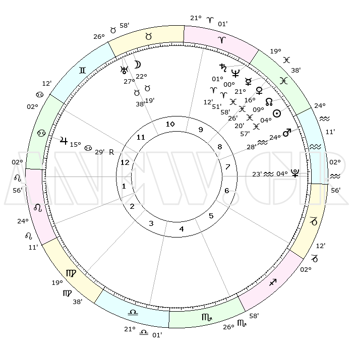 | | ΘΕΣΕΙΣ ΠΛΑΝΗΤΩΝ ΑΣΤΡΟΛΟΓΙΚΟΥ ΧΑΡΤΗ ΤΗΣ ΣΤΙΓΜΗΣ ΑΥΤΗΣ | | | | Πλανήτης | Ζώδιο | Μοίρες | Δεκαήμ. | Σε οίκο | Απόκλιση | | Ακμές των οίκων | | Ηλιος | Ιχθείς | 04°53' | Πρώτο | 9 | 09 S 43 | | 1ος | 15°38' | Καρκίνος | | Σελήνη | Ταύρος | 21°29' | Τρίτο | 11 | 22 N 59 | | 2ος | 06°05' | Λέων | | Ερμής | Ιχθείς | 21°56' | Τρίτο | 9 | 01 S 14 | | 3ος | 29°18' | Λέων | | Αφροδίτη | Ιχθείς | 16°22' | Δεύτερο | 9 | 06 S 42 | | 4ος | 28°13' | Παρθένος | | Αρης | Υδροχόος | 24°25' | Τρίτο | 8 | 14 S 24 | | 5ος | 03°58' | Σκορπιός | | Δίας | Καρκίνος | 15°29'R | Δεύτερο | 12 | 22 N 52 | | 6ος | 12°05' | Τοξότης | | Κρόνος | Κριός | 01°11' | Πρώτο | 10 | 01 S 29 | | 7ος | 15°38' | Αιγόκερως | | Ουρανός | Ταύρος | 27°38' | Τρίτο | 11 | 19 N 27 | | 8ος | 06°05' | Υδροχόος | | Ποσειδώνας | Κριός | 00°51' | Πρώτο | 10 | 00 S 52 | | 9ος | 29°18' | Υδροχόος | | Πλούτωνας | Υδροχόος | 04°23' | Πρώτο | 7 | 22 S 54 | | 10ος | 28°13' | Ιχθείς | | Β. Δεσμός | Ιχθείς | 09°20' | Πρώτο | 9 | 08 S 04 | | 11ος | 03°58' | Ταύρος | | Ωροσκόπος | Καρκίνος | 15°38' | Δεύτερο | | | 12ος | 12°05' | Δίδυμοι | | Μεσουράνημα | Ιχθείς | 28°13' | Τρίτο | | | |