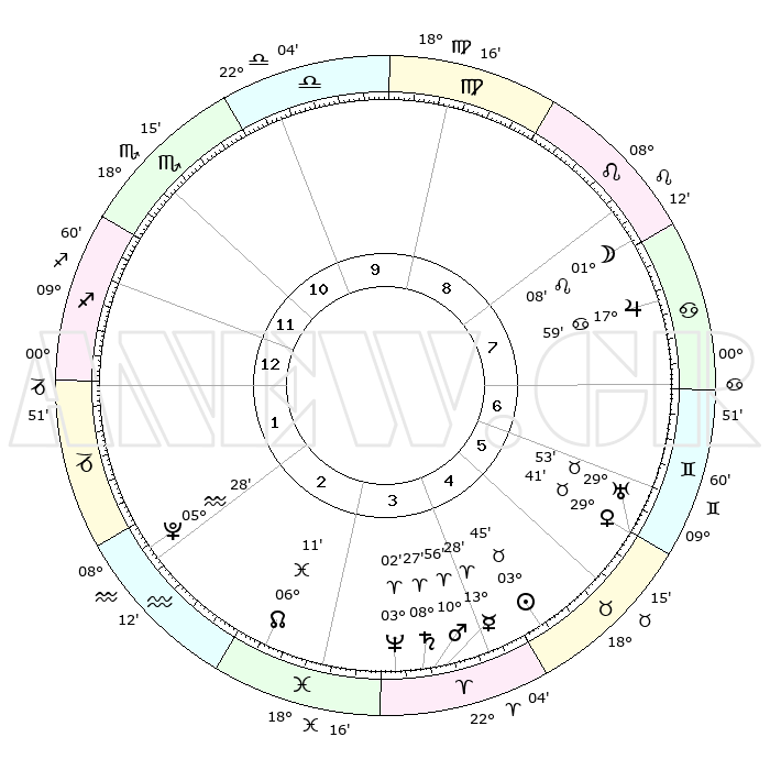 | | ΘΕΣΕΙΣ ΠΛΑΝΗΤΩΝ ΑΣΤΡΟΛΟΓΙΚΟΥ ΧΑΡΤΗ ΤΗΣ ΣΤΙΓΜΗΣ ΑΥΤΗΣ | | | | Πλανήτης | Ζώδιο | Μοίρες | Δεκαήμ. | Σε οίκο | Απόκλιση | | Ακμές των οίκων | | Ηλιος | Ταύρος | 03°41' | Πρώτο | 5 | 12 N 44 | | 1ος | 09°18' | Τοξότης | | Σελήνη | Λέων | 00°11' | Πρώτο | 8 | 23 N 07 | | 2ος | 11°54' | Αιγόκερως | | Ερμής | Κριός | 13°21' | Δεύτερο | 4 | 02 N 58 | | 3ος | 19°11' | Υδροχόος | | Αφροδίτη | Ταύρος | 29°36' | Τρίτο | 6 | 20 N 37 | | 4ος | 25°11' | Ιχθείς | | Αρης | Κριός | 10°52' | Δεύτερο | 4 | 03 N 27 | | 5ος | 24°55' | Κριός | | Δίας | Καρκίνος | 17°58' | Δεύτερο | 8 | 22 N 37 | | 6ος | 18°44' | Ταύρος | | Κρόνος | Κριός | 08°26' | Πρώτο | 4 | 01 N 22 | | 7ος | 09°18' | Δίδυμοι | | Ουρανός | Ταύρος | 29°53' | Τρίτο | 6 | 19 N 57 | | 8ος | 11°54' | Καρκίνος | | Ποσειδώνας | Κριός | 03°02' | Πρώτο | 4 | 00 S 00 | | 9ος | 19°11' | Λέων | | Πλούτωνας | Υδροχόος | 05°28' | Πρώτο | 2 | 22 S 48 | | 10ος | 25°11' | Παρθένος | | Β. Δεσμός | Ιχθείς | 06°12' | Πρώτο | 3 | 09 S 14 | | 11ος | 24°55' | Ζυγός | | Ωροσκόπος | Τοξότης | 09°18' | Πρώτο | | | 12ος | 18°44' | Σκορπιός | | Μεσουράνημα | Παρθένος | 25°11' | Τρίτο | | | |
