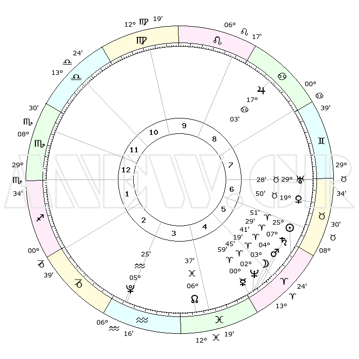 | | ΘΕΣΕΙΣ ΠΛΑΝΗΤΩΝ ΑΣΤΡΟΛΟΓΙΚΟΥ ΧΑΡΤΗ ΤΗΣ ΣΤΙΓΜΗΣ ΑΥΤΗΣ | | | | Πλανήτης | Ζώδιο | Μοίρες | Δεκαήμ. | Σε οίκο | Απόκλιση | | Ακμές των οίκων | | Ηλιος | Κριός | 25°47' | Τρίτο | 6 | 09 N 58 | | 1ος | 08°25' | Σκορπιός | | Σελήνη | Κριός | 02°18' | Πρώτο | 5 | 02 N 51 | | 2ος | 07°23' | Τοξότης | | Ερμής | Κριός | 00°52' | Πρώτο | 5 | 02 S 03 | | 3ος | 10°07' | Αιγόκερως | | Αφροδίτη | Ταύρος | 19°45' | Δεύτερο | 7 | 17 N 52 | | 4ος | 14°54' | Υδροχόος | | Αρης | Κριός | 04°37' | Πρώτο | 5 | 00 N 56 | | 5ος | 17°38' | Ιχθείς | | Δίας | Καρκίνος | 17°03' | Δεύτερο | 9 | 22 N 43 | | 6ος | 15°27' | Κριός | | Κρόνος | Κριός | 07°29' | Πρώτο | 5 | 01 N 00 | | 7ος | 08°25' | Ταύρος | | Ουρανός | Ταύρος | 29°28' | Τρίτο | 7 | 19 N 52 | | 8ος | 07°23' | Δίδυμοι | | Ποσειδώνας | Κριός | 02°45' | Πρώτο | 5 | 00 S 07 | | 9ος | 10°07' | Καρκίνος | | Πλούτωνας | Υδροχόος | 05°24' | Πρώτο | 3 | 22 S 47 | | 10ος | 14°54' | Λέων | | Β. Δεσμός | Ιχθείς | 06°37' | Πρώτο | 4 | 09 S 05 | | 11ος | 17°38' | Παρθένος | | Ωροσκόπος | Σκορπιός | 08°25' | Πρώτο | | | 12ος | 15°27' | Ζυγός | | Μεσουράνημα | Λέων | 14°54' | Δεύτερο | | | |