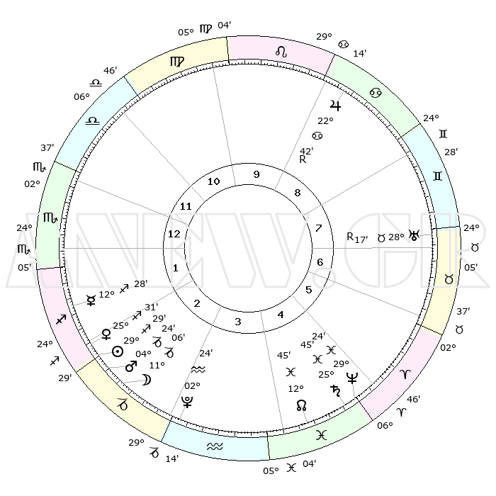 | | ΘΕΣΕΙΣ ΠΛΑΝΗΤΩΝ ΑΣΤΡΟΛΟΓΙΚΟΥ ΧΑΡΤΗ ΤΗΣ ΣΤΙΓΜΗΣ ΑΥΤΗΣ | | | | Πλανήτης | Ζώδιο | Μοίρες | Δεκαήμ. | Σε οίκο | Απόκλιση | | Ακμές των οίκων | | Ηλιος | Τοξότης | 28°55' | Τρίτο | 8 | 23 S 26 | | 1ος | 01°22' | Δίδυμοι | | Σελήνη | Αιγόκερως | 04°14' | Πρώτο | 8 | 28 S 00 | | 2ος | 25°54' | Δίδυμοι | | Ερμής | Τοξότης | 11°39' | Δεύτερο | 7 | 21 S 22 | | 3ος | 17°17' | Καρκίνος | | Αφροδίτη | Τοξότης | 24°49' | Τρίτο | 7 | 23 S 23 | | 4ος | 10°09' | Λέων | | Αρης | Αιγόκερως | 03°58' | Πρώτο | 8 | 24 S 11 | | 5ος | 08°51' | Παρθένος | | Δίας | Καρκίνος | 22°46'R | Τρίτο | 3 | 21 N 43 | | 6ος | 17°30' | Ζυγός | | Κρόνος | Ιχθείς | 25°44' | Τρίτο | 11 | 03 S 49 | | 7ος | 01°22' | Τοξότης | | Ουρανός | Ταύρος | 28°18'R | Τρίτο | 12 | 19 N 35 | | 8ος | 25°54' | Τοξότης | | Ποσειδώνας | Ιχθείς | 29°24' | Τρίτο | 11 | 01 S 28 | | 9ος | 17°17' | Αιγόκερως | | Πλούτωνας | Υδροχόος | 02°23' | Πρώτο | 9 | 23 S 17 | | 10ος | 10°09' | Υδροχόος | | Β. Δεσμός | Ιχθείς | 12°46' | Δεύτερο | 11 | 06 S 46 | | 11ος | 08°51' | Ιχθείς | | Ωροσκόπος | Δίδυμοι | 01°22' | Πρώτο | | | 12ος | 17°30' | Κριός | | Μεσουράνημα | Υδροχόος | 10°09' | Δεύτερο | | | |