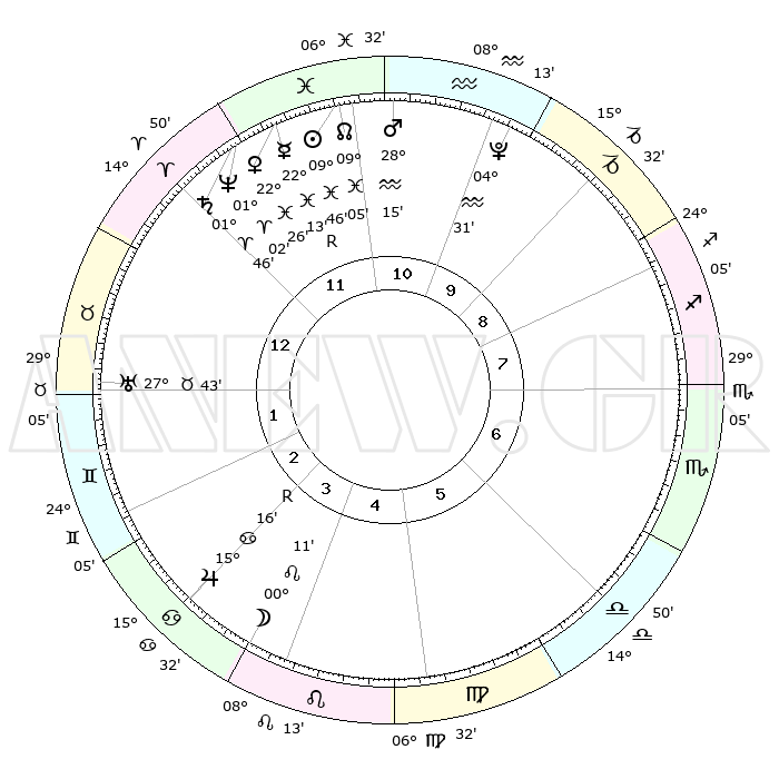 | | ΘΕΣΕΙΣ ΠΛΑΝΗΤΩΝ ΑΣΤΡΟΛΟΓΙΚΟΥ ΧΑΡΤΗ ΤΗΣ ΣΤΙΓΜΗΣ ΑΥΤΗΣ | | | | Πλανήτης | Ζώδιο | Μοίρες | Δεκαήμ. | Σε οίκο | Απόκλιση | | Ακμές των οίκων | | Ηλιος | Ιχθείς | 09°42' | Πρώτο | 11 | 07 S 56 | | 1ος | 28°44' | Κριός | | Σελήνη | Καρκίνος | 29°18' | Τρίτο | 4 | 23 N 36 | | 2ος | 01°18' | Δίδυμοι | | Ερμής | Ιχθείς | 22°14'R | Τρίτο | 12 | 00 S 09 | | 3ος | 24°60' | Δίδυμοι | | Αφροδίτη | Ιχθείς | 22°21' | Τρίτο | 12 | 04 S 18 | | 4ος | 16°40' | Καρκίνος | | Αρης | Υδροχόος | 28°12' | Τρίτο | 11 | 13 S 07 | | 5ος | 10°57' | Λέων | | Δίας | Καρκίνος | 15°17'R | Δεύτερο | 3 | 22 N 54 | | 6ος | 13°25' | Παρθένος | | Κρόνος | Κριός | 01°45' | Πρώτο | 12 | 01 S 16 | | 7ος | 28°44' | Ζυγός | | Ουρανός | Ταύρος | 27°43' | Τρίτο | 1 | 19 N 28 | | 8ος | 01°18' | Τοξότης | | Ποσειδώνας | Κριός | 01°01' | Πρώτο | 12 | 00 S 48 | | 9ος | 24°60' | Τοξότης | | Πλούτωνας | Υδροχόος | 04°31' | Πρώτο | 10 | 22 S 53 | | 10ος | 16°41' | Αιγόκερως | | Β. Δεσμός | Ιχθείς | 09°05' | Πρώτο | 11 | 08 S 10 | | 11ος | 10°57' | Υδροχόος | | Ωροσκόπος | Κριός | 28°44' | Τρίτο | | | 12ος | 13°25' | Ιχθείς | | Μεσουράνημα | Αιγόκερως | 16°41' | Δεύτερο | | | |