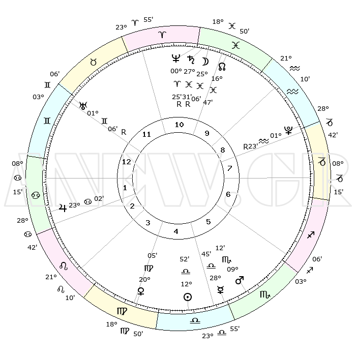| ΘΕΣΕΙΣ ΠΛΑΝΗΤΩΝ ΑΣΤΡΟΛΟΓΙΚΟΥ ΧΑΡΤΗ ΤΗΣ ΣΤΙΓΜΗΣ ΑΥΤΗΣ | | Πλανήτης | Ζώδιο | Μοίρες | Δεκαήμ. | Σε οίκο | Απόκλιση | | Ακμές των οίκων | Ηλιος | Ζυγός | 12°46' | Δεύτερο | 5 | 05 S 02 | | 1ος | 02°00' | Δίδυμοι | Σελήνη | Ιχθείς | 23°38' | Τρίτο | 11 | 02 S 05 | | 2ος | 26°25' | Δίδυμοι | Ερμής | Ζυγός | 28°36' | Τρίτο | 6 | 11 S 36 | | 3ος | 17°46' | Καρκίνος | Αφροδίτη | Παρθένος | 19°57' | Δεύτερο | 5 | 05 N 15 | | 4ος | 10°41' | Λέων | Αρης | Σκορπιός | 09°08' | Πρώτο | 6 | 14 S 39 | | 5ος | 09°30' | Παρθένος | Δίας | Καρκίνος | 23°01' | Τρίτο | 3 | 21 N 30 | | 6ος | 18°15' | Ζυγός | Κρόνος | Ιχθείς | 27°32'R | Τρίτο | 11 | 03 S 17 | | 7ος | 02°00' | Τοξότης | Ουρανός | Δίδυμοι | 01°06'R | Πρώτο | 12 | 20 N 10 | | 8ος | 26°25' | Τοξότης | Ποσειδώνας | Κριός | 00°25'R | Πρώτο | 11 | 01 S 06 | | 9ος | 17°46' | Αιγόκερως | Πλούτωνας | Υδροχόος | 01°23'R | Πρώτο | 9 | 23 S 32 | | 10ος | 10°41' | Υδροχόος | Β. Δεσμός | Ιχθείς | 16°47' | Δεύτερο | 11 | 05 S 13 | | 11ος | 09°30' | Ιχθείς | Ωροσκόπος | Δίδυμοι | 02°00' | Πρώτο | | | 12ος | 18°15' | Κριός | Μεσουράνημα | Υδροχόος | 10°41' | Δεύτερο | | | |