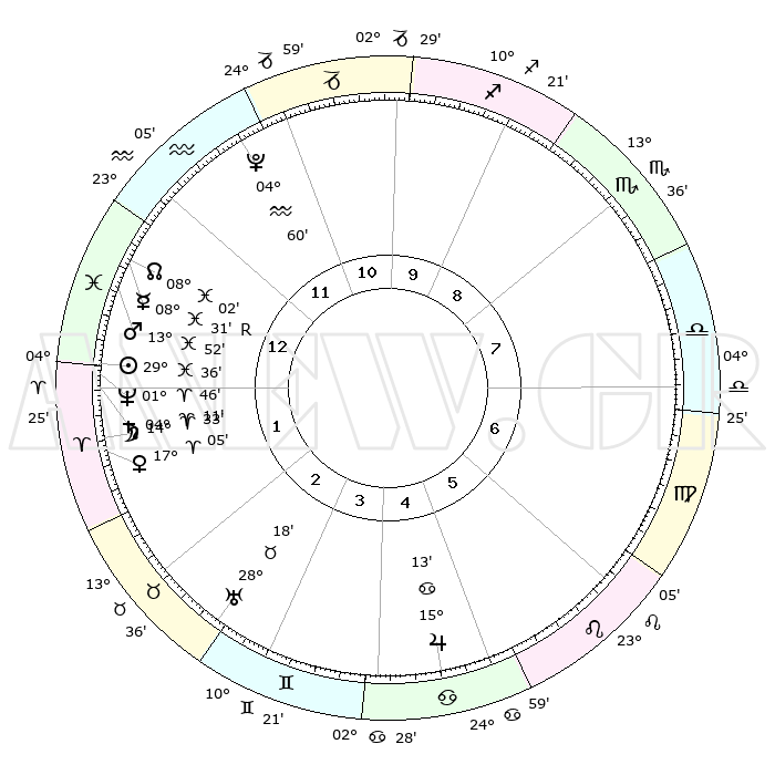 | | ΘΕΣΕΙΣ ΠΛΑΝΗΤΩΝ ΑΣΤΡΟΛΟΓΙΚΟΥ ΧΑΡΤΗ ΤΗΣ ΣΤΙΓΜΗΣ ΑΥΤΗΣ | | | | Πλανήτης | Ζώδιο | Μοίρες | Δεκαήμ. | Σε οίκο | Απόκλιση | | Ακμές των οίκων | | Ηλιος | Ιχθείς | 29°31' | Τρίτο | 1 | 00 S 12 | | 1ος | 22°26' | Υδροχόος | | Σελήνη | Κριός | 13°30' | Δεύτερο | 2 | 08 N 04 | | 2ος | 08°13' | Κριός | | Ερμής | Ιχθείς | 08°31'R | Πρώτο | 1 | 07 S 18 | | 3ος | 12°27' | Ταύρος | | Αφροδίτη | Κριός | 16°59' | Δεύτερο | 2 | 05 N 51 | | 4ος | 07°40' | Δίδυμοι | | Αρης | Ιχθείς | 13°49' | Δεύτερο | 1 | 07 S 22 | | 5ος | 29°26' | Δίδυμοι | | Δίας | Καρκίνος | 15°13' | Δεύτερο | 5 | 22 N 56 | | 6ος | 22°16' | Καρκίνος | | Κρόνος | Κριός | 04°11' | Πρώτο | 1 | 00 S 17 | | 7ος | 22°26' | Λέων | | Ουρανός | Ταύρος | 28°17' | Τρίτο | 3 | 19 N 36 | | 8ος | 08°13' | Ζυγός | | Ποσειδώνας | Κριός | 01°46' | Πρώτο | 1 | 00 S 30 | | 9ος | 12°27' | Σκορπιός | | Πλούτωνας | Υδροχόος | 04°60' | Πρώτο | 12 | 22 S 49 | | 10ος | 07°40' | Τοξότης | | Β. Δεσμός | Ιχθείς | 08°02' | Πρώτο | 1 | 08 S 33 | | 11ος | 29°26' | Τοξότης | | Ωροσκόπος | Υδροχόος | 22°26' | Τρίτο | | | 12ος | 22°16' | Αιγόκερως | | Μεσουράνημα | Τοξότης | 07°40' | Πρώτο | | | |