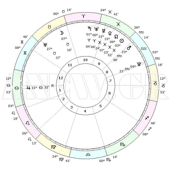 | | ΘΕΣΕΙΣ ΠΛΑΝΗΤΩΝ ΑΣΤΡΟΛΟΓΙΚΟΥ ΧΑΡΤΗ ΤΗΣ ΣΤΙΓΜΗΣ ΑΥΤΗΣ | | | | Πλανήτης | Ζώδιο | Μοίρες | Δεκαήμ. | Σε οίκο | Απόκλιση | | Ακμές των οίκων | | Ηλιος | Ιχθείς | 03°48' | Πρώτο | 10 | 10 S 07 | | 1ος | 19°18' | Δίδυμοι | | Σελήνη | Ταύρος | 06°16' | Πρώτο | 11 | 17 N 48 | | 2ος | 11°02' | Καρκίνος | | Ερμής | Ιχθείς | 21°22' | Τρίτο | 10 | 01 S 42 | | 3ος | 02°20' | Λέων | | Αφροδίτη | Ιχθείς | 15°01' | Δεύτερο | 10 | 07 S 13 | | 4ος | 27°05' | Λέων | | Αρης | Υδροχόος | 23°34' | Τρίτο | 9 | 14 S 41 | | 5ος | 29°08' | Παρθένος | | Δίας | Καρκίνος | 15°32'R | Δεύτερο | 2 | 22 N 52 | | 6ος | 09°25' | Σκορπιός | | Κρόνος | Κριός | 01°04' | Πρώτο | 11 | 01 S 32 | | 7ος | 19°18' | Τοξότης | | Ουρανός | Ταύρος | 27°36' | Τρίτο | 12 | 19 N 27 | | 8ος | 11°02' | Αιγόκερως | | Ποσειδώνας | Κριός | 00°49' | Πρώτο | 11 | 00 S 53 | | 9ος | 02°20' | Υδροχόος | | Πλούτωνας | Υδροχόος | 04°21' | Πρώτο | 9 | 22 S 54 | | 10ος | 27°05' | Υδροχόος | | Β. Δεσμός | Ιχθείς | 09°24' | Πρώτο | 10 | 08 S 03 | | 11ος | 29°08' | Ιχθείς | | Ωροσκόπος | Δίδυμοι | 19°18' | Δεύτερο | | | 12ος | 09°25' | Ταύρος | | Μεσουράνημα | Υδροχόος | 27°05' | Τρίτο | | | |
