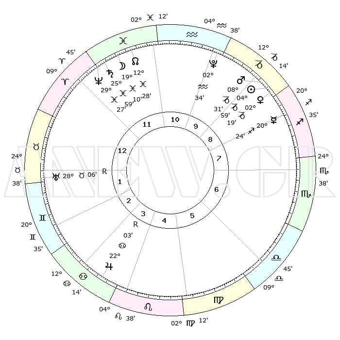 | | ΘΕΣΕΙΣ ΠΛΑΝΗΤΩΝ ΑΣΤΡΟΛΟΓΙΚΟΥ ΧΑΡΤΗ ΤΗΣ ΣΤΙΓΜΗΣ ΑΥΤΗΣ | | | | Πλανήτης | Ζώδιο | Μοίρες | Δεκαήμ. | Σε οίκο | Απόκλιση | | Ακμές των οίκων | | Ηλιος | Αιγόκερως | 04°55' | Πρώτο | 9 | 23 S 20 | | 1ος | 14°51' | Κριός | | Σελήνη | Ιχθείς | 18°09' | Δεύτερο | 12 | 04 S 08 | | 2ος | 21°16' | Ταύρος | | Ερμής | Τοξότης | 20°17' | Τρίτο | 9 | 23 S 00 | | 3ος | 16°35' | Δίδυμοι | | Αφροδίτη | Αιγόκερως | 02°14' | Πρώτο | 9 | 23 S 42 | | 4ος | 08°24' | Καρκίνος | | Αρης | Αιγόκερως | 08°27' | Πρώτο | 10 | 24 S 01 | | 5ος | 01°32' | Λέων | | Δίας | Καρκίνος | 22°04'R | Τρίτο | 4 | 21 N 51 | | 6ος | 01°24' | Παρθένος | | Κρόνος | Ιχθείς | 25°59' | Τρίτο | 12 | 03 S 41 | | 7ος | 14°51' | Ζυγός | | Ουρανός | Ταύρος | 28°06'R | Τρίτο | 2 | 19 N 32 | | 8ος | 21°16' | Σκορπιός | | Ποσειδώνας | Ιχθείς | 29°27' | Τρίτο | 12 | 01 S 27 | | 9ος | 16°35' | Τοξότης | | Πλούτωνας | Υδροχόος | 02°33' | Πρώτο | 11 | 23 S 15 | | 10ος | 08°24' | Αιγόκερως | | Β. Δεσμός | Ιχθείς | 12°28' | Δεύτερο | 12 | 06 S 53 | | 11ος | 01°32' | Υδροχόος | | Ωροσκόπος | Κριός | 14°51' | Δεύτερο | | | 12ος | 01°24' | Ιχθείς | | Μεσουράνημα | Αιγόκερως | 08°24' | Πρώτο | | | |