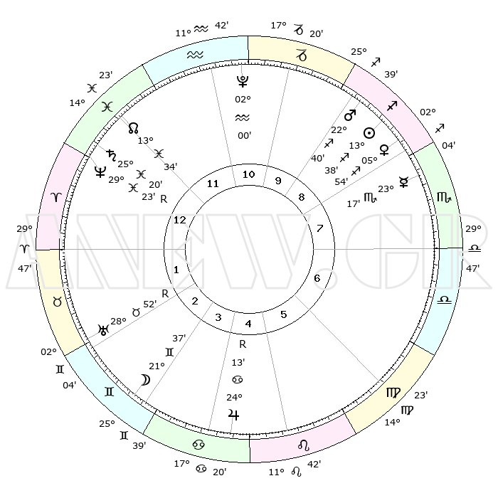| | ΘΕΣΕΙΣ ΠΛΑΝΗΤΩΝ ΑΣΤΡΟΛΟΓΙΚΟΥ ΧΑΡΤΗ ΤΗΣ ΣΤΙΓΜΗΣ ΑΥΤΗΣ | | | | Πλανήτης | Ζώδιο | Μοίρες | Δεκαήμ. | Σε οίκο | Απόκλιση | | Ακμές των οίκων | | Ηλιος | Τοξότης | 13°36' | Δεύτερο | 9 | 22 S 26 | | 1ος | 08°58' | Κριός | | Σελήνη | Δίδυμοι | 21°03' | Τρίτο | 3 | 28 N 04 | | 2ος | 16°59' | Ταύρος | | Ερμής | Σκορπιός | 23°15' | Τρίτο | 8 | 16 S 09 | | 3ος | 13°04' | Δίδυμοι | | Αφροδίτη | Τοξότης | 05°52' | Πρώτο | 8 | 20 S 45 | | 4ος | 05°03' | Καρκίνος | | Αρης | Τοξότης | 22°39' | Τρίτο | 9 | 23 S 56 | | 5ος | 27°48' | Καρκίνος | | Δίας | Καρκίνος | 24°13'R | Τρίτο | 4 | 21 N 26 | | 6ος | 26°39' | Λέων | | Κρόνος | Ιχθείς | 25°20' | Τρίτο | 12 | 04 S 01 | | 7ος | 08°58' | Ζυγός | | Ουρανός | Ταύρος | 28°52'R | Τρίτο | 2 | 19 N 42 | | 8ος | 16°59' | Σκορπιός | | Ποσειδώνας | Ιχθείς | 29°23'R | Τρίτο | 12 | 01 S 29 | | 9ος | 13°04' | Τοξότης | | Πλούτωνας | Υδροχόος | 02°00' | Πρώτο | 11 | 23 S 23 | | 10ος | 05°03' | Αιγόκερως | | Β. Δεσμός | Ιχθείς | 13°34' | Δεύτερο | 12 | 06 S 27 | | 11ος | 27°48' | Αιγόκερως | | Ωροσκόπος | Κριός | 08°58' | Πρώτο | | | 12ος | 26°39' | Υδροχόος | | Μεσουράνημα | Αιγόκερως | 05°03' | Πρώτο | | | |