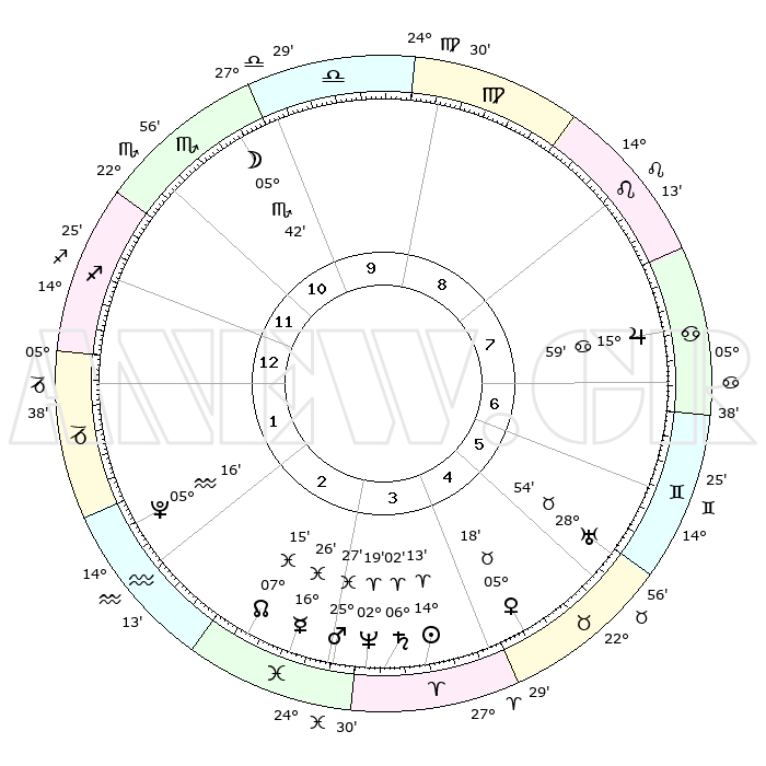 | | ΘΕΣΕΙΣ ΠΛΑΝΗΤΩΝ ΑΣΤΡΟΛΟΓΙΚΟΥ ΧΑΡΤΗ ΤΗΣ ΣΤΙΓΜΗΣ ΑΥΤΗΣ | | | | Πλανήτης | Ζώδιο | Μοίρες | Δεκαήμ. | Σε οίκο | Απόκλιση | | Ακμές των οίκων | | Ηλιος | Κριός | 14°09' | Δεύτερο | 4 | 05 N 35 | | 1ος | 15°03' | Τοξότης | | Σελήνη | Σκορπιός | 04°55' | Πρώτο | 11 | 17 S 13 | | 2ος | 18°44' | Αιγόκερως | | Ερμής | Ιχθείς | 16°23' | Δεύτερο | 3 | 06 S 58 | | 3ος | 26°57' | Υδροχόος | | Αφροδίτη | Ταύρος | 05°14' | Πρώτο | 5 | 12 N 57 | | 4ος | 02°40' | Κριός | | Αρης | Ιχθείς | 25°24' | Τρίτο | 3 | 02 S 47 | | 5ος | 01°28' | Ταύρος | | Δίας | Καρκίνος | 15°59' | Δεύτερο | 7 | 22 N 51 | | 6ος | 24°37' | Ταύρος | | Κρόνος | Κριός | 06°01' | Πρώτο | 4 | 00 N 26 | | 7ος | 15°03' | Δίδυμοι | | Ουρανός | Ταύρος | 28°54' | Τρίτο | 6 | 19 N 44 | | 8ος | 18°44' | Καρκίνος | | Ποσειδώνας | Κριός | 02°19' | Πρώτο | 3 | 00 S 17 | | 9ος | 26°57' | Λέων | | Πλούτωνας | Υδροχόος | 05°16' | Πρώτο | 2 | 22 S 47 | | 10ος | 02°40' | Ζυγός | | Β. Δεσμός | Ιχθείς | 07°15' | Πρώτο | 3 | 08 S 51 | | 11ος | 01°28' | Σκορπιός | | Ωροσκόπος | Τοξότης | 15°03' | Δεύτερο | | | 12ος | 24°37' | Σκορπιός | | Μεσουράνημα | Ζυγός | 02°40' | Πρώτο | | | |