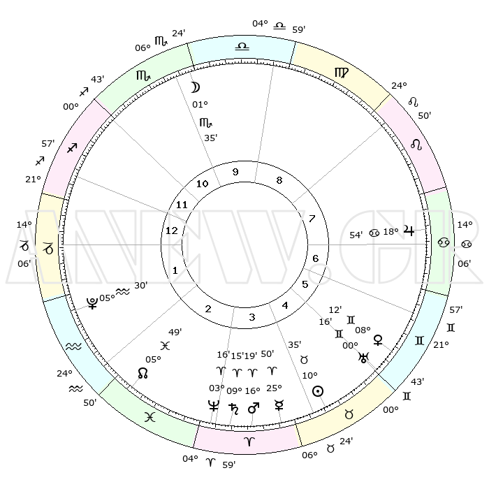 | | ΘΕΣΕΙΣ ΠΛΑΝΗΤΩΝ ΑΣΤΡΟΛΟΓΙΚΟΥ ΧΑΡΤΗ ΤΗΣ ΣΤΙΓΜΗΣ ΑΥΤΗΣ | | | | Πλανήτης | Ζώδιο | Μοίρες | Δεκαήμ. | Σε οίκο | Απόκλιση | | Ακμές των οίκων | | Ηλιος | Ταύρος | 10°32' | Δεύτερο | 4 | 14 N 59 | | 1ος | 29°35' | Τοξότης | | Σελήνη | Σκορπιός | 01°04' | Πρώτο | 10 | 15 S 40 | | 2ος | 06°38' | Υδροχόος | | Ερμής | Κριός | 25°46' | Τρίτο | 4 | 08 N 09 | | 3ος | 16°36' | Ιχθείς | | Αφροδίτη | Δίδυμοι | 08°09' | Πρώτο | 5 | 22 N 33 | | 4ος | 20°36' | Κριός | | Αρης | Κριός | 16°17' | Δεύτερο | 3 | 05 N 35 | | 5ος | 16°59' | Ταύρος | | Δίας | Καρκίνος | 18°54' | Δεύτερο | 7 | 22 N 29 | | 6ος | 08°49' | Δίδυμοι | | Κρόνος | Κριός | 09°15' | Πρώτο | 3 | 01 N 40 | | 7ος | 29°35' | Δίδυμοι | | Ουρανός | Δίδυμοι | 00°16' | Πρώτο | 5 | 20 N 02 | | 8ος | 06°38' | Λέων | | Ποσειδώνας | Κριός | 03°16' | Πρώτο | 3 | 00 N 05 | | 9ος | 16°36' | Παρθένος | | Πλούτωνας | Υδροχόος | 05°30' | Πρώτο | 1 | 22 S 49 | | 10ος | 20°36' | Ζυγός | | Β. Δεσμός | Ιχθείς | 05°49' | Πρώτο | 2 | 09 S 22 | | 11ος | 16°59' | Σκορπιός | | Ωροσκόπος | Τοξότης | 29°35' | Τρίτο | | | 12ος | 08°49' | Τοξότης | | Μεσουράνημα | Ζυγός | 20°36' | Τρίτο | | | |