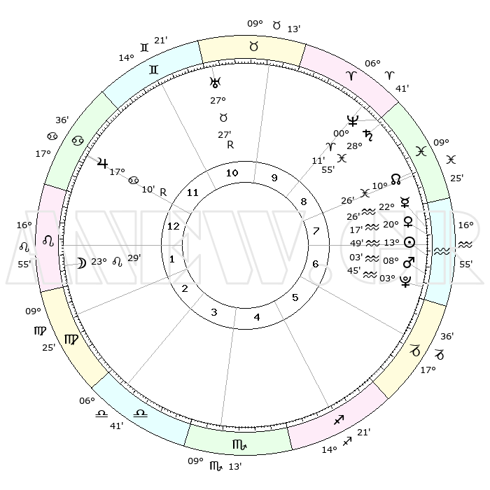 | | ΘΕΣΕΙΣ ΠΛΑΝΗΤΩΝ ΑΣΤΡΟΛΟΓΙΚΟΥ ΧΑΡΤΗ ΤΗΣ ΣΤΙΓΜΗΣ ΑΥΤΗΣ | | | | Πλανήτης | Ζώδιο | Μοίρες | Δεκαήμ. | Σε οίκο | Απόκλιση | | Ακμές των οίκων | | Ηλιος | Υδροχόος | 13°45' | Δεύτερο | 7 | 16 S 42 | | 1ος | 26°19' | Καρκίνος | | Σελήνη | Λέων | 22°30' | Τρίτο | 2 | 15 N 25 | | 2ος | 17°08' | Λέων | | Ερμής | Υδροχόος | 22°19' | Τρίτο | 8 | 15 S 45 | | 3ος | 11°41' | Παρθένος | | Αφροδίτη | Υδροχόος | 20°11' | Τρίτο | 8 | 16 S 04 | | 4ος | 12°14' | Ζυγός | | Αρης | Υδροχόος | 07°59' | Πρώτο | 7 | 19 S 17 | | 5ος | 18°20' | Σκορπιός | | Δίας | Καρκίνος | 17°11'R | Δεύτερο | 12 | 22 N 38 | | 6ος | 24°39' | Τοξότης | | Κρόνος | Ιχθείς | 28°55' | Τρίτο | 9 | 02 S 25 | | 7ος | 26°19' | Αιγόκερως | | Ουρανός | Ταύρος | 27°27'R | Τρίτο | 11 | 19 N 24 | | 8ος | 17°08' | Υδροχόος | | Ποσειδώνας | Κριός | 00°11' | Πρώτο | 9 | 01 S 08 | | 9ος | 11°41' | Ιχθείς | | Πλούτωνας | Υδροχόος | 03°45' | Πρώτο | 7 | 23 S 01 | | 10ος | 12°14' | Κριός | | Β. Δεσμός | Ιχθείς | 10°27' | Δεύτερο | 8 | 07 S 39 | | 11ος | 18°20' | Ταύρος | | Ωροσκόπος | Καρκίνος | 26°19' | Τρίτο | | | 12ος | 24°39' | Δίδυμοι | | Μεσουράνημα | Κριός | 12°14' | Δεύτερο | | | |