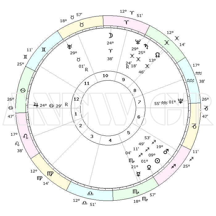 | | ΘΕΣΕΙΣ ΠΛΑΝΗΤΩΝ ΑΣΤΡΟΛΟΓΙΚΟΥ ΧΑΡΤΗ ΤΗΣ ΣΤΙΓΜΗΣ ΑΥΤΗΣ | | | | Πλανήτης | Ζώδιο | Μοίρες | Δεκαήμ. | Σε οίκο | Απόκλιση | | Ακμές των οίκων | | Ηλιος | Τοξότης | 09°47' | Πρώτο | 5 | 21 S 55 | | 1ος | 16°25' | Καρκίνος | | Σελήνη | Κριός | 24°07' | Τρίτο | 10 | 12 N 21 | | 2ος | 06°53' | Λέων | | Ερμής | Σκορπιός | 21°03' | Τρίτο | 5 | 15 S 29 | | 3ος | 00°11' | Παρθένος | | Αφροδίτη | Τοξότης | 01°08' | Πρώτο | 5 | 19 S 43 | | 4ος | 29°14' | Παρθένος | | Αρης | Τοξότης | 19°51' | Δεύτερο | 6 | 23 S 43 | | 5ος | 05°02' | Σκορπιός | | Δίας | Καρκίνος | 24°29'R | Τρίτο | 1 | 21 N 23 | | 6ος | 13°01' | Τοξότης | | Κρόνος | Ιχθείς | 25°18' | Τρίτο | 9 | 04 S 03 | | 7ος | 16°25' | Αιγόκερως | | Ουρανός | Ταύρος | 29°01'R | Τρίτο | 11 | 19 N 44 | | 8ος | 06°53' | Υδροχόος | | Ποσειδώνας | Ιχθείς | 29°24'R | Τρίτο | 10 | 01 S 29 | | 9ος | 00°11' | Ιχθείς | | Πλούτωνας | Υδροχόος | 01°55' | Πρώτο | 7 | 23 S 24 | | 10ος | 29°14' | Ιχθείς | | Β. Δεσμός | Ιχθείς | 13°46' | Δεύτερο | 9 | 06 S 23 | | 11ος | 05°02' | Ταύρος | | Ωροσκόπος | Καρκίνος | 16°25' | Δεύτερο | | | 12ος | 13°01' | Δίδυμοι | | Μεσουράνημα | Ιχθείς | 29°14' | Τρίτο | | | |