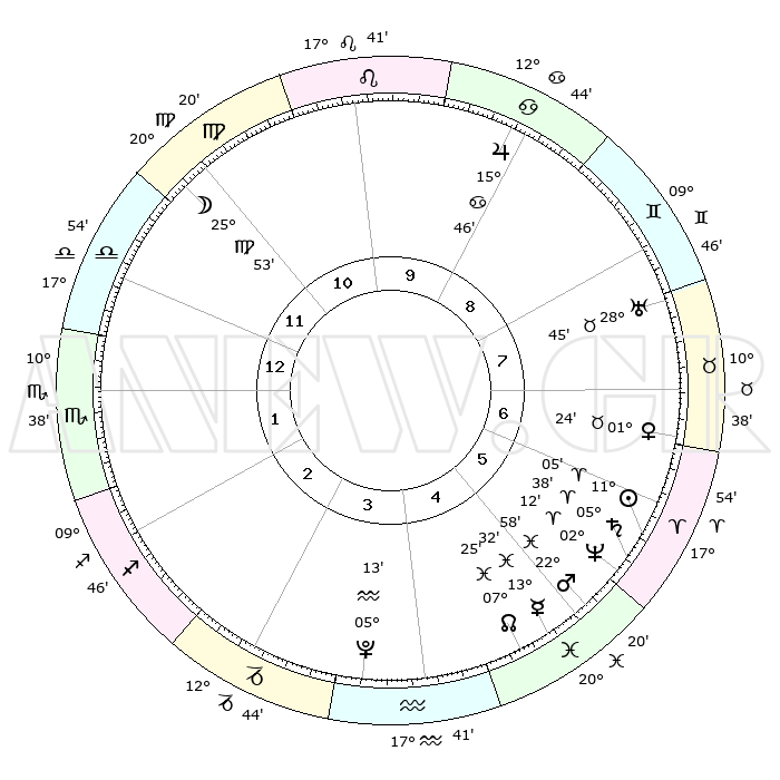 | | ΘΕΣΕΙΣ ΠΛΑΝΗΤΩΝ ΑΣΤΡΟΛΟΓΙΚΟΥ ΧΑΡΤΗ ΤΗΣ ΣΤΙΓΜΗΣ ΑΥΤΗΣ | | | | Πλανήτης | Ζώδιο | Μοίρες | Δεκαήμ. | Σε οίκο | Απόκλιση | | Ακμές των οίκων | | Ηλιος | Κριός | 11°01' | Δεύτερο | 6 | 04 N 22 | | 1ος | 22°28' | Ζυγός | | Σελήνη | Παρθένος | 25°05' | Τρίτο | 11 | 00 N 36 | | 2ος | 20°26' | Σκορπιός | | Ερμής | Ιχθείς | 13°29' | Δεύτερο | 5 | 07 S 40 | | 3ος | 21°52' | Τοξότης | | Αφροδίτη | Ταύρος | 01°20' | Πρώτο | 7 | 11 N 30 | | 4ος | 25°36' | Αιγόκερως | | Αρης | Ιχθείς | 22°55' | Τρίτο | 5 | 03 S 46 | | 5ος | 28°33' | Υδροχόος | | Δίας | Καρκίνος | 15°46' | Δεύτερο | 9 | 22 N 52 | | 6ος | 27°50' | Ιχθείς | | Κρόνος | Κριός | 05°38' | Πρώτο | 6 | 00 N 17 | | 7ος | 22°28' | Κριός | | Ουρανός | Ταύρος | 28°45' | Τρίτο | 8 | 19 N 43 | | 8ος | 20°26' | Ταύρος | | Ποσειδώνας | Κριός | 02°12' | Πρώτο | 6 | 00 S 20 | | 9ος | 21°52' | Δίδυμοι | | Πλούτωνας | Υδροχόος | 05°13' | Πρώτο | 4 | 22 S 47 | | 10ος | 25°36' | Καρκίνος | | Β. Δεσμός | Ιχθείς | 07°25' | Πρώτο | 5 | 08 S 47 | | 11ος | 28°33' | Λέων | | Ωροσκόπος | Ζυγός | 22°28' | Τρίτο | | | 12ος | 27°50' | Παρθένος | | Μεσουράνημα | Καρκίνος | 25°36' | Τρίτο | | | |