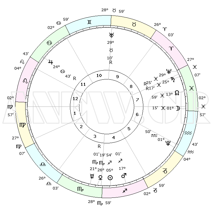 | | ΘΕΣΕΙΣ ΠΛΑΝΗΤΩΝ ΑΣΤΡΟΛΟΓΙΚΟΥ ΧΑΡΤΗ ΤΗΣ ΣΤΙΓΜΗΣ ΑΥΤΗΣ | | | | Πλανήτης | Ζώδιο | Μοίρες | Δεκαήμ. | Σε οίκο | Απόκλιση | | Ακμές των οίκων | | Ηλιος | Τοξότης | 05°53' | Πρώτο | 4 | 21 S 17 | | 1ος | 25°17' | Λέων | | Σελήνη | Ιχθείς | 00°55' | Πρώτο | 7 | 12 S 15 | | 2ος | 18°38' | Παρθένος | | Ερμής | Σκορπιός | 21°02'R | Τρίτο | 4 | 15 S 43 | | 3ος | 16°51' | Ζυγός | | Αφροδίτη | Σκορπιός | 26°17' | Τρίτο | 4 | 18 S 31 | | 4ος | 19°41' | Σκορπιός | | Αρης | Τοξότης | 16°60' | Δεύτερο | 4 | 23 S 26 | | 5ος | 24°13' | Τοξότης | | Δίας | Καρκίνος | 24°43'R | Τρίτο | 11 | 21 N 20 | | 6ος | 26°34' | Αιγόκερως | | Κρόνος | Ιχθείς | 25°17'R | Τρίτο | 8 | 04 S 04 | | 7ος | 25°17' | Υδροχόος | | Ουρανός | Ταύρος | 29°10'R | Τρίτο | 10 | 19 N 46 | | 8ος | 18°38' | Ιχθείς | | Ποσειδώνας | Ιχθείς | 29°25'R | Τρίτο | 8 | 01 S 29 | | 9ος | 16°51' | Κριός | | Πλούτωνας | Υδροχόος | 01°50' | Πρώτο | 6 | 23 S 25 | | 10ος | 19°41' | Ταύρος | | Β. Δεσμός | Ιχθείς | 13°59' | Δεύτερο | 7 | 06 S 18 | | 11ος | 24°13' | Δίδυμοι | | Ωροσκόπος | Λέων | 25°17' | Τρίτο | | | 12ος | 26°34' | Καρκίνος | | Μεσουράνημα | Ταύρος | 19°41' | Δεύτερο | | | |