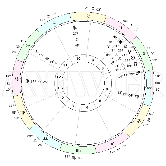 | | ΘΕΣΕΙΣ ΠΛΑΝΗΤΩΝ ΑΣΤΡΟΛΟΓΙΚΟΥ ΧΑΡΤΗ ΤΗΣ ΣΤΙΓΜΗΣ ΑΥΤΗΣ | | | | Πλανήτης | Ζώδιο | Μοίρες | Δεκαήμ. | Σε οίκο | Απόκλιση | | Ακμές των οίκων | | Ηλιος | Ιχθείς | 10°58' | Δεύτερο | 8 | 07 S 27 | | 1ος | 03°16' | Λέων | | Σελήνη | Λέων | 16°40' | Δεύτερο | 1 | 17 N 45 | | 2ος | 24°32' | Λέων | | Ερμής | Ιχθείς | 21°43'R | Τρίτο | 9 | 00 S 11 | | 3ος | 20°01' | Παρθένος | | Αφροδίτη | Ιχθείς | 23°54' | Τρίτο | 9 | 03 S 40 | | 4ος | 21°26' | Ζυγός | | Αρης | Υδροχόος | 29°11' | Τρίτο | 8 | 12 S 47 | | 5ος | 27°23' | Σκορπιός | | Δίας | Καρκίνος | 15°14'R | Δεύτερο | 12 | 22 N 54 | | 6ος | 02°34' | Αιγόκερως | | Κρόνος | Κριός | 01°54' | Πρώτο | 9 | 01 S 12 | | 7ος | 03°16' | Υδροχόος | | Ουρανός | Ταύρος | 27°45' | Τρίτο | 11 | 19 N 29 | | 8ος | 24°32' | Υδροχόος | | Ποσειδώνας | Κριός | 01°04' | Πρώτο | 9 | 00 S 46 | | 9ος | 20°01' | Ιχθείς | | Πλούτωνας | Υδροχόος | 04°33' | Πρώτο | 7 | 22 S 52 | | 10ος | 21°26' | Κριός | | Β. Δεσμός | Ιχθείς | 09°01' | Πρώτο | 8 | 08 S 11 | | 11ος | 27°23' | Ταύρος | | Ωροσκόπος | Λέων | 03°16' | Πρώτο | | | 12ος | 02°34' | Καρκίνος | | Μεσουράνημα | Κριός | 21°26' | Τρίτο | | | |