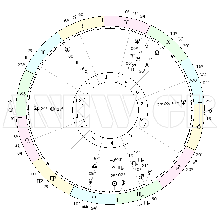 | ΘΕΣΕΙΣ ΠΛΑΝΗΤΩΝ ΑΣΤΡΟΛΟΓΙΚΟΥ ΧΑΡΤΗ ΤΗΣ ΣΤΙΓΜΗΣ ΑΥΤΗΣ | | Πλανήτης | Ζώδιο | Μοίρες | Δεκαήμ. | Σε οίκο | Απόκλιση | | Ακμές των οίκων | Ηλιος | Ζυγός | 28°22' | Τρίτο | 8 | 10 S 53 | | 1ος | 13°53' | Υδροχόος | Σελήνη | Ζυγός | 28°21' | Τρίτο | 8 | 14 S 01 | | 2ος | 29°32' | Ιχθείς | Ερμής | Σκορπιός | 20°47' | Τρίτο | 9 | 20 S 13 | | 3ος | 05°28' | Ταύρος | Αφροδίτη | Ζυγός | 09°30' | Πρώτο | 8 | 02 S 21 | | 4ος | 01°46' | Δίδυμοι | Αρης | Σκορπιός | 20°04' | Τρίτο | 9 | 18 S 02 | | 5ος | 23°46' | Δίδυμοι | Δίας | Καρκίνος | 24°26' | Τρίτο | 6 | 21 N 17 | | 6ος | 15°56' | Καρκίνος | Κρόνος | Ιχθείς | 26°29'R | Τρίτο | 1 | 03 S 41 | | 7ος | 13°53' | Λέων | Ουρανός | Δίδυμοι | 00°39'R | Πρώτο | 3 | 20 N 04 | | 8ος | 29°32' | Παρθένος | Ποσειδώνας | Κριός | 00°01'R | Πρώτο | 2 | 01 S 15 | | 9ος | 05°28' | Σκορπιός | Πλούτωνας | Υδροχόος | 01°23' | Πρώτο | 12 | 23 S 32 | | 10ος | 01°46' | Τοξότης | Β. Δεσμός | Ιχθείς | 15°57' | Δεύτερο | 1 | 05 S 32 | | 11ος | 23°46' | Τοξότης | Ωροσκόπος | Υδροχόος | 13°53' | Δεύτερο | | | 12ος | 15°56' | Αιγόκερως | Μεσουράνημα | Τοξότης | 01°46' | Πρώτο | | | |