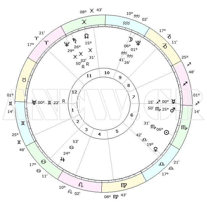 | | ΘΕΣΕΙΣ ΠΛΑΝΗΤΩΝ ΑΣΤΡΟΛΟΓΙΚΟΥ ΧΑΡΤΗ ΤΗΣ ΣΤΙΓΜΗΣ ΑΥΤΗΣ | | | | Πλανήτης | Ζώδιο | Μοίρες | Δεκαήμ. | Σε οίκο | Απόκλιση | | Ακμές των οίκων | | Ηλιος | Σκορπιός | 06°05' | Πρώτο | 12 | 13 S 33 | | 1ος | 23°49' | Σκορπιός | | Σελήνη | Υδροχόος | 01°15' | Πρώτο | 3 | 23 S 28 | | 2ος | 24°10' | Τοξότης | | Ερμής | Σκορπιός | 29°48' | Τρίτο | 1 | 22 S 53 | | 3ος | 28°53' | Αιγόκερως | | Αφροδίτη | Ζυγός | 19°09' | Δεύτερο | 11 | 06 S 06 | | 4ος | 04°42' | Ιχθείς | | Αρης | Σκορπιός | 25°32' | Τρίτο | 1 | 19 S 30 | | 5ος | 06°25' | Κριός | | Δίας | Καρκίνος | 24°51' | Τρίτο | 8 | 21 N 14 | | 6ος | 02°19' | Ταύρος | | Κρόνος | Ιχθείς | 26°03'R | Τρίτο | 4 | 03 S 50 | | 7ος | 23°49' | Ταύρος | | Ουρανός | Δίδυμοι | 00°23'R | Πρώτο | 7 | 20 N 01 | | 8ος | 24°10' | Δίδυμοι | | Ποσειδώνας | Ιχθείς | 29°51'R | Τρίτο | 4 | 01 S 19 | | 9ος | 28°53' | Καρκίνος | | Πλούτωνας | Υδροχόος | 01°25' | Πρώτο | 3 | 23 S 31 | | 10ος | 04°42' | Παρθένος | | Β. Δεσμός | Ιχθείς | 15°33' | Δεύτερο | 4 | 05 S 42 | | 11ος | 06°25' | Ζυγός | | Ωροσκόπος | Σκορπιός | 23°49' | Τρίτο | | | 12ος | 02°19' | Σκορπιός | | Μεσουράνημα | Παρθένος | 04°42' | Πρώτο | | | |