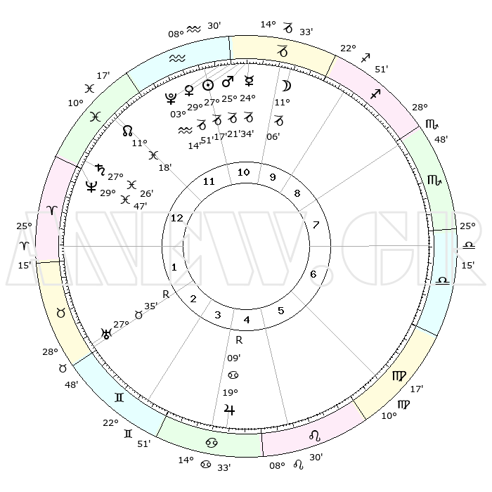 | | ΘΕΣΕΙΣ ΠΛΑΝΗΤΩΝ ΑΣΤΡΟΛΟΓΙΚΟΥ ΧΑΡΤΗ ΤΗΣ ΣΤΙΓΜΗΣ ΑΥΤΗΣ | | | | Πλανήτης | Ζώδιο | Μοίρες | Δεκαήμ. | Σε οίκο | Απόκλιση | | Ακμές των οίκων | | Ηλιος | Αιγόκερως | 27°12' | Τρίτο | 11 | 20 S 43 | | 1ος | 10°34' | Ιχθείς | | Σελήνη | Αιγόκερως | 10°10' | Δεύτερο | 10 | 27 S 28 | | 2ος | 24°46' | Κριός | | Ερμής | Αιγόκερως | 24°26' | Τρίτο | 11 | 23 S 06 | | 3ος | 25°28' | Ταύρος | | Αφροδίτη | Αιγόκερως | 29°45' | Τρίτο | 11 | 21 S 13 | | 4ος | 18°56' | Δίδυμοι | | Αρης | Αιγόκερως | 25°18' | Τρίτο | 11 | 22 S 02 | | 5ος | 10°40' | Καρκίνος | | Δίας | Καρκίνος | 19°10'R | Δεύτερο | 5 | 22 N 20 | | 6ος | 05°25' | Λέων | | Κρόνος | Ιχθείς | 27°26' | Τρίτο | 1 | 03 S 03 | | 7ος | 10°34' | Παρθένος | | Ουρανός | Ταύρος | 27°36'R | Τρίτο | 3 | 19 N 26 | | 8ος | 24°46' | Ζυγός | | Ποσειδώνας | Ιχθείς | 29°47' | Τρίτο | 1 | 01 S 18 | | 9ος | 25°28' | Σκορπιός | | Πλούτωνας | Υδροχόος | 03°14' | Πρώτο | 11 | 23 S 07 | | 10ος | 18°56' | Τοξότης | | Β. Δεσμός | Ιχθείς | 11°18' | Δεύτερο | 1 | 07 S 19 | | 11ος | 10°40' | Αιγόκερως | | Ωροσκόπος | Ιχθείς | 10°34' | Δεύτερο | | | 12ος | 05°25' | Υδροχόος | | Μεσουράνημα | Τοξότης | 18°56' | Δεύτερο | | | |