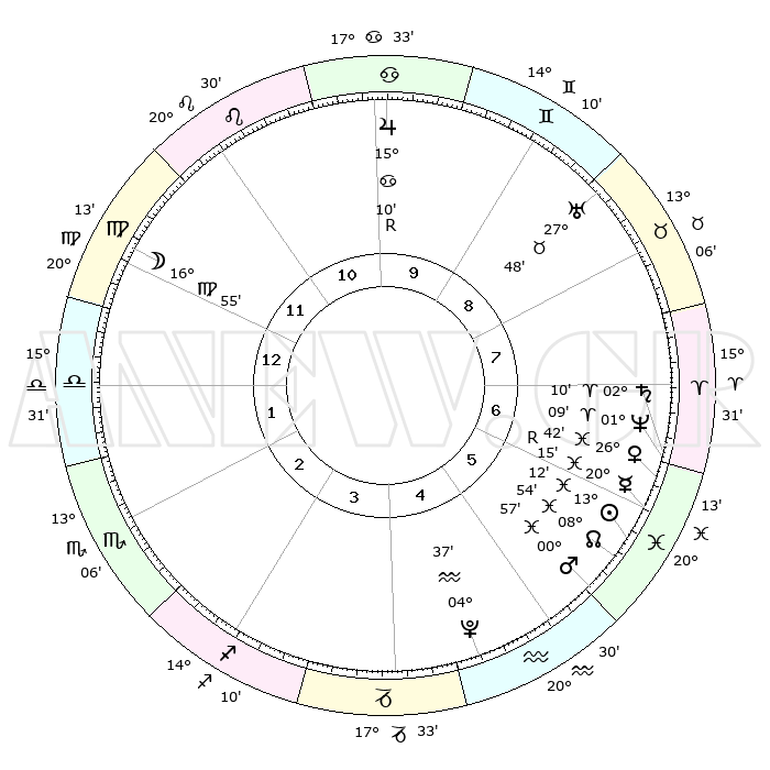 | | ΘΕΣΕΙΣ ΠΛΑΝΗΤΩΝ ΑΣΤΡΟΛΟΓΙΚΟΥ ΧΑΡΤΗ ΤΗΣ ΣΤΙΓΜΗΣ ΑΥΤΗΣ | | | | Πλανήτης | Ζώδιο | Μοίρες | Δεκαήμ. | Σε οίκο | Απόκλιση | | Ακμές των οίκων | | Ηλιος | Ιχθείς | 13°09' | Δεύτερο | 6 | 06 S 37 | | 1ος | 29°34' | Παρθένος | | Σελήνη | Παρθένος | 16°12' | Δεύτερο | 12 | 04 N 50 | | 2ος | 26°07' | Ζυγός | | Ερμής | Ιχθείς | 20°18'R | Τρίτο | 6 | 00 S 31 | | 3ος | 26°32' | Σκορπιός | | Αφροδίτη | Ιχθείς | 26°38' | Τρίτο | 6 | 02 S 33 | | 4ος | 29°31' | Τοξότης | | Αρης | Ιχθείς | 00°54' | Πρώτο | 5 | 12 S 10 | | 5ος | 02°30' | Υδροχόος | | Δίας | Καρκίνος | 15°10'R | Δεύτερο | 10 | 22 N 55 | | 6ος | 02°57' | Ιχθείς | | Κρόνος | Κριός | 02°10' | Πρώτο | 7 | 01 S 06 | | 7ος | 29°34' | Ιχθείς | | Ουρανός | Ταύρος | 27°48' | Τρίτο | 9 | 19 N 29 | | 8ος | 26°07' | Κριός | | Ποσειδώνας | Κριός | 01°09' | Πρώτο | 7 | 00 S 45 | | 9ος | 26°32' | Ταύρος | | Πλούτωνας | Υδροχόος | 04°37' | Πρώτο | 5 | 22 S 52 | | 10ος | 29°31' | Δίδυμοι | | Β. Δεσμός | Ιχθείς | 08°54' | Πρώτο | 6 | 08 S 14 | | 11ος | 02°30' | Λέων | | Ωροσκόπος | Παρθένος | 29°34' | Τρίτο | | | 12ος | 02°57' | Παρθένος | | Μεσουράνημα | Δίδυμοι | 29°31' | Τρίτο | | | |