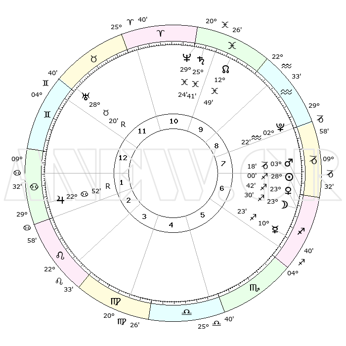 | | ΘΕΣΕΙΣ ΠΛΑΝΗΤΩΝ ΑΣΤΡΟΛΟΓΙΚΟΥ ΧΑΡΤΗ ΤΗΣ ΣΤΙΓΜΗΣ ΑΥΤΗΣ | | | | Πλανήτης | Ζώδιο | Μοίρες | Δεκαήμ. | Σε οίκο | Απόκλιση | | Ακμές των οίκων | | Ηλιος | Τοξότης | 27°56' | Τρίτο | 7 | 23 S 25 | | 1ος | 16°54' | Δίδυμοι | | Σελήνη | Τοξότης | 22°42' | Τρίτο | 7 | 28 S 08 | | 2ος | 08°54' | Καρκίνος | | Ερμής | Τοξότης | 10°17' | Δεύτερο | 6 | 21 S 03 | | 3ος | 00°10' | Λέων | | Αφροδίτη | Τοξότης | 23°36' | Τρίτο | 7 | 23 S 18 | | 4ος | 24°36' | Λέων | | Αρης | Αιγόκερως | 03°15' | Πρώτο | 7 | 24 S 12 | | 5ος | 26°12' | Παρθένος | | Δίας | Καρκίνος | 22°52'R | Τρίτο | 2 | 21 N 42 | | 6ος | 06°24' | Σκορπιός | | Κρόνος | Ιχθείς | 25°41' | Τρίτο | 10 | 03 S 50 | | 7ος | 16°54' | Τοξότης | | Ουρανός | Ταύρος | 28°20'R | Τρίτο | 12 | 19 N 35 | | 8ος | 08°54' | Αιγόκερως | | Ποσειδώνας | Ιχθείς | 29°24' | Τρίτο | 11 | 01 S 28 | | 9ος | 00°10' | Υδροχόος | | Πλούτωνας | Υδροχόος | 02°22' | Πρώτο | 9 | 23 S 18 | | 10ος | 24°36' | Υδροχόος | | Β. Δεσμός | Ιχθείς | 12°50' | Δεύτερο | 10 | 06 S 45 | | 11ος | 26°12' | Ιχθείς | | Ωροσκόπος | Δίδυμοι | 16°54' | Δεύτερο | | | 12ος | 06°24' | Ταύρος | | Μεσουράνημα | Υδροχόος | 24°36' | Τρίτο | | | |