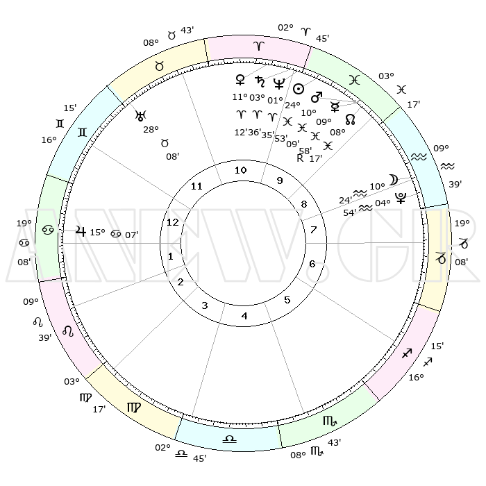 | | ΘΕΣΕΙΣ ΠΛΑΝΗΤΩΝ ΑΣΤΡΟΛΟΓΙΚΟΥ ΧΑΡΤΗ ΤΗΣ ΣΤΙΓΜΗΣ ΑΥΤΗΣ | | | | Πλανήτης | Ζώδιο | Μοίρες | Δεκαήμ. | Σε οίκο | Απόκλιση | | Ακμές των οίκων | | Ηλιος | Ιχθείς | 24°49' | Τρίτο | 10 | 02 S 03 | | 1ος | 02°55' | Καρκίνος | | Σελήνη | Υδροχόος | 09°44' | Πρώτο | 8 | 20 S 17 | | 2ος | 23°33' | Καρκίνος | | Ερμής | Ιχθείς | 10°00'R | Δεύτερο | 9 | 05 S 40 | | 3ος | 15°34' | Λέων | | Αφροδίτη | Κριός | 11°09' | Δεύτερο | 10 | 03 N 27 | | 4ος | 12°21' | Παρθένος | | Αρης | Ιχθείς | 10°06' | Δεύτερο | 9 | 08 S 47 | | 5ος | 16°44' | Ζυγός | | Δίας | Καρκίνος | 15°07' | Δεύτερο | 1 | 22 N 56 | | 6ος | 26°30' | Σκορπιός | | Κρόνος | Κριός | 03°36' | Πρώτο | 10 | 00 S 31 | | 7ος | 02°55' | Αιγόκερως | | Ουρανός | Ταύρος | 28°08' | Τρίτο | 12 | 19 N 34 | | 8ος | 23°33' | Αιγόκερως | | Ποσειδώνας | Κριός | 01°35' | Πρώτο | 10 | 00 S 34 | | 9ος | 15°34' | Υδροχόος | | Πλούτωνας | Υδροχόος | 04°54' | Πρώτο | 8 | 22 S 49 | | 10ος | 12°21' | Ιχθείς | | Β. Δεσμός | Ιχθείς | 08°17' | Πρώτο | 9 | 08 S 28 | | 11ος | 16°44' | Κριός | | Ωροσκόπος | Καρκίνος | 02°55' | Πρώτο | | | 12ος | 26°30' | Ταύρος | | Μεσουράνημα | Ιχθείς | 12°21' | Δεύτερο | | | |