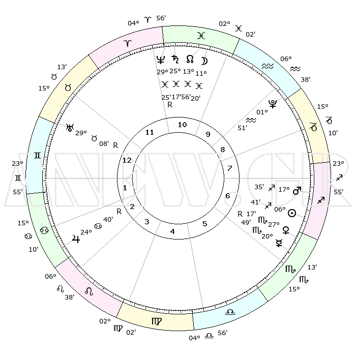 | | ΘΕΣΕΙΣ ΠΛΑΝΗΤΩΝ ΑΣΤΡΟΛΟΓΙΚΟΥ ΧΑΡΤΗ ΤΗΣ ΣΤΙΓΜΗΣ ΑΥΤΗΣ | | | | Πλανήτης | Ζώδιο | Μοίρες | Δεκαήμ. | Σε οίκο | Απόκλιση | | Ακμές των οίκων | | Ηλιος | Τοξότης | 06°40' | Πρώτο | 6 | 21 S 25 | | 1ος | 18°31' | Δίδυμοι | | Σελήνη | Ιχθείς | 11°08' | Δεύτερο | 10 | 07 S 39 | | 2ος | 10°20' | Καρκίνος | | Ερμής | Σκορπιός | 20°49'R | Τρίτο | 6 | 15 S 35 | | 3ος | 01°38' | Λέων | | Αφροδίτη | Σκορπιός | 27°16' | Τρίτο | 6 | 18 S 47 | | 4ος | 26°16' | Λέων | | Αρης | Τοξότης | 17°34' | Δεύτερο | 6 | 23 S 30 | | 5ος | 28°10' | Παρθένος | | Δίας | Καρκίνος | 24°40'R | Τρίτο | 2 | 21 N 20 | | 6ος | 08°26' | Σκορπιός | | Κρόνος | Ιχθείς | 25°17' | Τρίτο | 10 | 04 S 03 | | 7ος | 18°31' | Τοξότης | | Ουρανός | Ταύρος | 29°09'R | Τρίτο | 12 | 19 N 46 | | 8ος | 10°20' | Αιγόκερως | | Ποσειδώνας | Ιχθείς | 29°25'R | Τρίτο | 11 | 01 S 29 | | 9ος | 01°38' | Υδροχόος | | Πλούτωνας | Υδροχόος | 01°51' | Πρώτο | 9 | 23 S 25 | | 10ος | 26°16' | Υδροχόος | | Β. Δεσμός | Ιχθείς | 13°56' | Δεύτερο | 10 | 06 S 19 | | 11ος | 28°10' | Ιχθείς | | Ωροσκόπος | Δίδυμοι | 18°31' | Δεύτερο | | | 12ος | 08°26' | Ταύρος | | Μεσουράνημα | Υδροχόος | 26°16' | Τρίτο | | | |