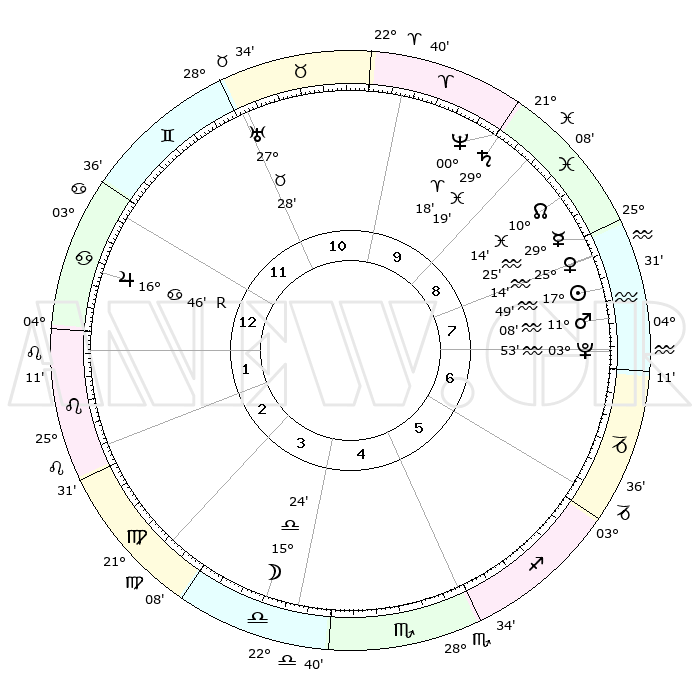 | | ΘΕΣΕΙΣ ΠΛΑΝΗΤΩΝ ΑΣΤΡΟΛΟΓΙΚΟΥ ΧΑΡΤΗ ΤΗΣ ΣΤΙΓΜΗΣ ΑΥΤΗΣ | | | | Πλανήτης | Ζώδιο | Μοίρες | Δεκαήμ. | Σε οίκο | Απόκλιση | | Ακμές των οίκων | | Ηλιος | Υδροχόος | 17°45' | Δεύτερο | 8 | 15 S 31 | | 1ος | 12°29' | Καρκίνος | | Σελήνη | Ζυγός | 14°29' | Δεύτερο | 4 | 08 S 31 | | 2ος | 02°54' | Λέων | | Ερμής | Υδροχόος | 29°18' | Τρίτο | 9 | 13 S 01 | | 3ος | 25°46' | Λέων | | Αφροδίτη | Υδροχόος | 25°08' | Τρίτο | 8 | 14 S 29 | | 4ος | 24°09' | Παρθένος | | Αρης | Υδροχόος | 11°05' | Δεύτερο | 8 | 18 S 28 | | 5ος | 29°41' | Ζυγός | | Δίας | Καρκίνος | 16°46'R | Δεύτερο | 1 | 22 N 42 | | 6ος | 08°16' | Τοξότης | | Κρόνος | Ιχθείς | 29°19' | Τρίτο | 10 | 02 S 15 | | 7ος | 12°29' | Αιγόκερως | | Ουρανός | Ταύρος | 27°28' | Τρίτο | 11 | 19 N 24 | | 8ος | 02°54' | Υδροχόος | | Ποσειδώνας | Κριός | 00°18' | Πρώτο | 10 | 01 S 05 | | 9ος | 25°46' | Υδροχόος | | Πλούτωνας | Υδροχόος | 03°53' | Πρώτο | 8 | 22 S 59 | | 10ος | 24°09' | Ιχθείς | | Β. Δεσμός | Ιχθείς | 10°14' | Δεύτερο | 9 | 07 S 44 | | 11ος | 29°41' | Κριός | | Ωροσκόπος | Καρκίνος | 12°29' | Δεύτερο | | | 12ος | 08°16' | Δίδυμοι | | Μεσουράνημα | Ιχθείς | 24°09' | Τρίτο | | | |