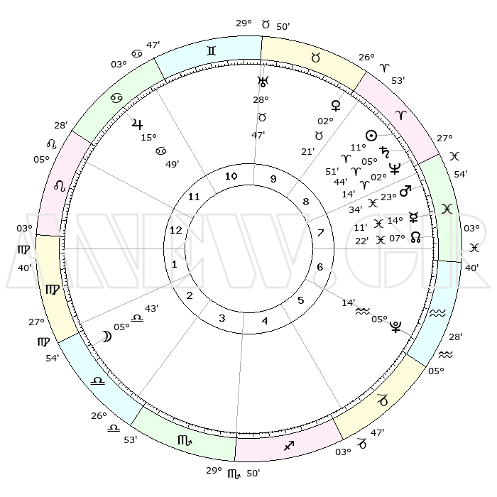 | | ΘΕΣΕΙΣ ΠΛΑΝΗΤΩΝ ΑΣΤΡΟΛΟΓΙΚΟΥ ΧΑΡΤΗ ΤΗΣ ΣΤΙΓΜΗΣ ΑΥΤΗΣ | | | | Πλανήτης | Ζώδιο | Μοίρες | Δεκαήμ. | Σε οίκο | Απόκλιση | | Ακμές των οίκων | | Ηλιος | Κριός | 11°47' | Δεύτερο | 9 | 04 N 39 | | 1ος | 14°07' | Λέων | | Σελήνη | Ζυγός | 04°52' | Πρώτο | 3 | 04 S 02 | | 2ος | 06°20' | Παρθένος | | Ερμής | Ιχθείς | 14°08' | Δεύτερο | 8 | 07 S 31 | | 3ος | 03°15' | Ζυγός | | Αφροδίτη | Ταύρος | 02°16' | Πρώτο | 9 | 11 N 52 | | 4ος | 05°37' | Σκορπιός | | Αρης | Ιχθείς | 23°31' | Τρίτο | 8 | 03 S 32 | | 5ος | 10°58' | Τοξότης | | Δίας | Καρκίνος | 15°49' | Δεύτερο | 12 | 22 N 52 | | 6ος | 14°33' | Αιγόκερως | | Κρόνος | Κριός | 05°43' | Πρώτο | 9 | 00 N 19 | | 7ος | 14°07' | Υδροχόος | | Ουρανός | Ταύρος | 28°47' | Τρίτο | 10 | 19 N 43 | | 8ος | 06°20' | Ιχθείς | | Ποσειδώνας | Κριός | 02°14' | Πρώτο | 8 | 00 S 19 | | 9ος | 03°15' | Κριός | | Πλούτωνας | Υδροχόος | 05°14' | Πρώτο | 6 | 22 S 47 | | 10ος | 05°37' | Ταύρος | | Β. Δεσμός | Ιχθείς | 07°23' | Πρώτο | 8 | 08 S 48 | | 11ος | 10°58' | Δίδυμοι | | Ωροσκόπος | Λέων | 14°07' | Δεύτερο | | | 12ος | 14°33' | Καρκίνος | | Μεσουράνημα | Ταύρος | 05°37' | Πρώτο | | | |