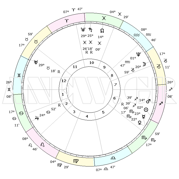| | ΘΕΣΕΙΣ ΠΛΑΝΗΤΩΝ ΑΣΤΡΟΛΟΓΙΚΟΥ ΧΑΡΤΗ ΤΗΣ ΣΤΙΓΜΗΣ ΑΥΤΗΣ | | | | Πλανήτης | Ζώδιο | Μοίρες | Δεκαήμ. | Σε οίκο | Απόκλιση | | Ακμές των οίκων | | Ηλιος | Τοξότης | 02°36' | Πρώτο | 6 | 20 S 40 | | 1ος | 06°10' | Δίδυμοι | | Σελήνη | Αιγόκερως | 20°19' | Τρίτο | 8 | 25 S 55 | | 2ος | 29°48' | Δίδυμοι | | Ερμής | Σκορπιός | 23°09'R | Τρίτο | 6 | 16 S 49 | | 3ος | 21°04' | Καρκίνος | | Αφροδίτη | Σκορπιός | 22°13' | Τρίτο | 6 | 17 S 25 | | 4ος | 14°20' | Λέων | | Αρης | Τοξότης | 14°36' | Δεύτερο | 7 | 23 S 09 | | 5ος | 13°54' | Παρθένος | | Δίας | Καρκίνος | 24°52'R | Τρίτο | 3 | 21 N 17 | | 6ος | 23°12' | Ζυγός | | Κρόνος | Ιχθείς | 25°18'R | Τρίτο | 11 | 04 S 04 | | 7ος | 06°10' | Τοξότης | | Ουρανός | Ταύρος | 29°19'R | Τρίτο | 12 | 19 N 48 | | 8ος | 29°48' | Τοξότης | | Ποσειδώνας | Ιχθείς | 29°27'R | Τρίτο | 11 | 01 S 28 | | 9ος | 21°04' | Αιγόκερως | | Πλούτωνας | Υδροχόος | 01°47' | Πρώτο | 9 | 23 S 26 | | 10ος | 14°20' | Υδροχόος | | Β. Δεσμός | Ιχθείς | 14°09' | Δεύτερο | 11 | 06 S 14 | | 11ος | 13°54' | Ιχθείς | | Ωροσκόπος | Δίδυμοι | 06°10' | Πρώτο | | | 12ος | 23°12' | Κριός | | Μεσουράνημα | Υδροχόος | 14°20' | Δεύτερο | | | |