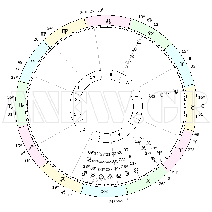 | | ΘΕΣΕΙΣ ΠΛΑΝΗΤΩΝ ΑΣΤΡΟΛΟΓΙΚΟΥ ΧΑΡΤΗ ΤΗΣ ΣΤΙΓΜΗΣ ΑΥΤΗΣ | | | | Πλανήτης | Ζώδιο | Μοίρες | Δεκαήμ. | Σε οίκο | Απόκλιση | | Ακμές των οίκων | | Ηλιος | Υδροχόος | 00°53' | Πρώτο | 4 | 19 S 57 | | 1ος | 25°40' | Ζυγός | | Σελήνη | Υδροχόος | 25°31' | Τρίτο | 4 | 14 S 11 | | 2ος | 23°49' | Σκορπιός | | Ερμής | Υδροχόος | 00°25' | Πρώτο | 4 | 22 S 03 | | 3ος | 25°28' | Τοξότης | | Αφροδίτη | Υδροχόος | 04°18' | Πρώτο | 4 | 20 S 17 | | 4ος | 29°22' | Αιγόκερως | | Αρης | Αιγόκερως | 28°06' | Τρίτο | 3 | 21 S 31 | | 5ος | 02°19' | Ιχθείς | | Δίας | Καρκίνος | 18°42'R | Δεύτερο | 9 | 22 N 25 | | 6ος | 01°21' | Κριός | | Κρόνος | Ιχθείς | 27°44' | Τρίτο | 5 | 02 S 55 | | 7ος | 25°40' | Κριός | | Ουρανός | Ταύρος | 27°33'R | Τρίτο | 8 | 19 N 25 | | 8ος | 23°49' | Ταύρος | | Ποσειδώνας | Ιχθείς | 29°52' | Τρίτο | 5 | 01 S 16 | | 9ος | 25°28' | Δίδυμοι | | Πλούτωνας | Υδροχόος | 03°21' | Πρώτο | 4 | 23 S 05 | | 10ος | 29°22' | Καρκίνος | | Β. Δεσμός | Ιχθείς | 11°07' | Δεύτερο | 5 | 07 S 24 | | 11ος | 02°19' | Παρθένος | | Ωροσκόπος | Ζυγός | 25°40' | Τρίτο | | | 12ος | 01°21' | Ζυγός | | Μεσουράνημα | Καρκίνος | 29°22' | Τρίτο | | | |
