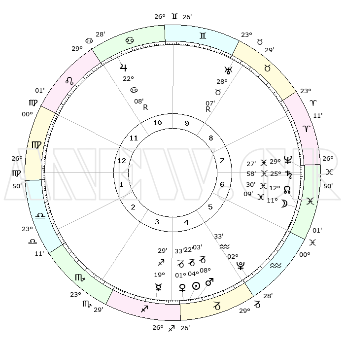 | | ΘΕΣΕΙΣ ΠΛΑΝΗΤΩΝ ΑΣΤΡΟΛΟΓΙΚΟΥ ΧΑΡΤΗ ΤΗΣ ΣΤΙΓΜΗΣ ΑΥΤΗΣ | | | | Πλανήτης | Ζώδιο | Μοίρες | Δεκαήμ. | Σε οίκο | Απόκλιση | | Ακμές των οίκων | | Ηλιος | Αιγόκερως | 04°17' | Πρώτο | 5 | 23 S 22 | | 1ος | 03°23' | Παρθένος | | Σελήνη | Ιχθείς | 10°06' | Δεύτερο | 7 | 07 S 52 | | 2ος | 27°35' | Παρθένος | | Ερμής | Τοξότης | 19°22' | Δεύτερο | 4 | 22 S 51 | | 3ος | 26°33' | Ζυγός | | Αφροδίτη | Αιγόκερως | 01°27' | Πρώτο | 4 | 23 S 42 | | 4ος | 29°30' | Σκορπιός | | Αρης | Αιγόκερως | 07°59' | Πρώτο | 5 | 24 S 03 | | 5ος | 03°28' | Αιγόκερως | | Δίας | Καρκίνος | 22°08'R | Τρίτο | 11 | 21 N 50 | | 6ος | 05°10' | Υδροχόος | | Κρόνος | Ιχθείς | 25°57' | Τρίτο | 7 | 03 S 42 | | 7ος | 03°23' | Ιχθείς | | Ουρανός | Ταύρος | 28°08'R | Τρίτο | 9 | 19 N 33 | | 8ος | 27°35' | Ιχθείς | | Ποσειδώνας | Ιχθείς | 29°27' | Τρίτο | 8 | 01 S 27 | | 9ος | 26°33' | Κριός | | Πλούτωνας | Υδροχόος | 02°32' | Πρώτο | 5 | 23 S 15 | | 10ος | 29°30' | Ταύρος | | Β. Δεσμός | Ιχθείς | 12°30' | Δεύτερο | 7 | 06 S 52 | | 11ος | 03°28' | Καρκίνος | | Ωροσκόπος | Παρθένος | 03°23' | Πρώτο | | | 12ος | 05°10' | Λέων | | Μεσουράνημα | Ταύρος | 29°30' | Τρίτο | | | |