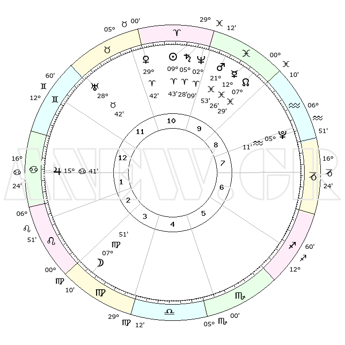 | | ΘΕΣΕΙΣ ΠΛΑΝΗΤΩΝ ΑΣΤΡΟΛΟΓΙΚΟΥ ΧΑΡΤΗ ΤΗΣ ΣΤΙΓΜΗΣ ΑΥΤΗΣ | | | | Πλανήτης | Ζώδιο | Μοίρες | Δεκαήμ. | Σε οίκο | Απόκλιση | | Ακμές των οίκων | | Ηλιος | Κριός | 09°38' | Πρώτο | 11 | 03 N 49 | | 1ος | 17°11' | Δίδυμοι | | Σελήνη | Παρθένος | 06°41' | Πρώτο | 4 | 09 N 14 | | 2ος | 09°09' | Καρκίνος | | Ερμής | Ιχθείς | 12°22' | Δεύτερο | 10 | 07 S 52 | | 3ος | 00°25' | Λέων | | Αφροδίτη | Κριός | 29°35' | Τρίτο | 11 | 10 N 51 | | 4ος | 24°53' | Λέων | | Αρης | Ιχθείς | 21°49' | Τρίτο | 10 | 04 S 13 | | 5ος | 26°32' | Παρθένος | | Δίας | Καρκίνος | 15°40' | Δεύτερο | 2 | 22 N 53 | | 6ος | 06°45' | Σκορπιός | | Κρόνος | Κριός | 05°27' | Πρώτο | 11 | 00 N 13 | | 7ος | 17°11' | Τοξότης | | Ουρανός | Ταύρος | 28°41' | Τρίτο | 12 | 19 N 42 | | 8ος | 09°09' | Αιγόκερως | | Ποσειδώνας | Κριός | 02°09' | Πρώτο | 11 | 00 S 21 | | 9ος | 00°25' | Υδροχόος | | Πλούτωνας | Υδροχόος | 05°11' | Πρώτο | 9 | 22 S 48 | | 10ος | 24°53' | Υδροχόος | | Β. Δεσμός | Ιχθείς | 07°30' | Πρώτο | 10 | 08 S 45 | | 11ος | 26°32' | Ιχθείς | | Ωροσκόπος | Δίδυμοι | 17°11' | Δεύτερο | | | 12ος | 06°45' | Ταύρος | | Μεσουράνημα | Υδροχόος | 24°53' | Τρίτο | | | |