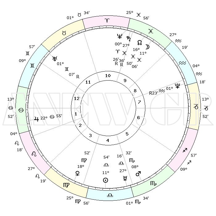 | ΘΕΣΕΙΣ ΠΛΑΝΗΤΩΝ ΑΣΤΡΟΛΟΓΙΚΟΥ ΧΑΡΤΗ ΤΗΣ ΣΤΙΓΜΗΣ ΑΥΤΗΣ | | Πλανήτης | Ζώδιο | Μοίρες | Δεκαήμ. | Σε οίκο | Απόκλιση | | Ακμές των οίκων | Ηλιος | Ζυγός | 11°49' | Δεύτερο | 5 | 04 S 40 | | 1ος | 13°04' | Δίδυμοι | Σελήνη | Ιχθείς | 09°48' | Πρώτο | 10 | 08 S 36 | | 2ος | 05°36' | Καρκίνος | Ερμής | Ζυγός | 27°07' | Τρίτο | 5 | 10 S 58 | | 3ος | 26°49' | Καρκίνος | Αφροδίτη | Παρθένος | 18°45' | Δεύτερο | 4 | 05 N 42 | | 4ος | 20°47' | Λέων | Αρης | Σκορπιός | 08°28' | Πρώτο | 6 | 14 S 26 | | 5ος | 21°39' | Παρθένος | Δίας | Καρκίνος | 22°55' | Τρίτο | 2 | 21 N 31 | | 6ος | 01°38' | Σκορπιός | Κρόνος | Ιχθείς | 27°36'R | Τρίτο | 11 | 03 S 15 | | 7ος | 13°04' | Τοξότης | Ουρανός | Δίδυμοι | 01°07'R | Πρώτο | 12 | 20 N 10 | | 8ος | 05°36' | Αιγόκερως | Ποσειδώνας | Κριός | 00°27'R | Πρώτο | 11 | 01 S 05 | | 9ος | 26°49' | Αιγόκερως | Πλούτωνας | Υδροχόος | 01°23'R | Πρώτο | 9 | 23 S 32 | | 10ος | 20°47' | Υδροχόος | Β. Δεσμός | Ιχθείς | 16°50' | Δεύτερο | 10 | 05 S 12 | | 11ος | 21°39' | Ιχθείς | Ωροσκόπος | Δίδυμοι | 13°04' | Δεύτερο | | | 12ος | 01°38' | Ταύρος | Μεσουράνημα | Υδροχόος | 20°47' | Τρίτο | | | |