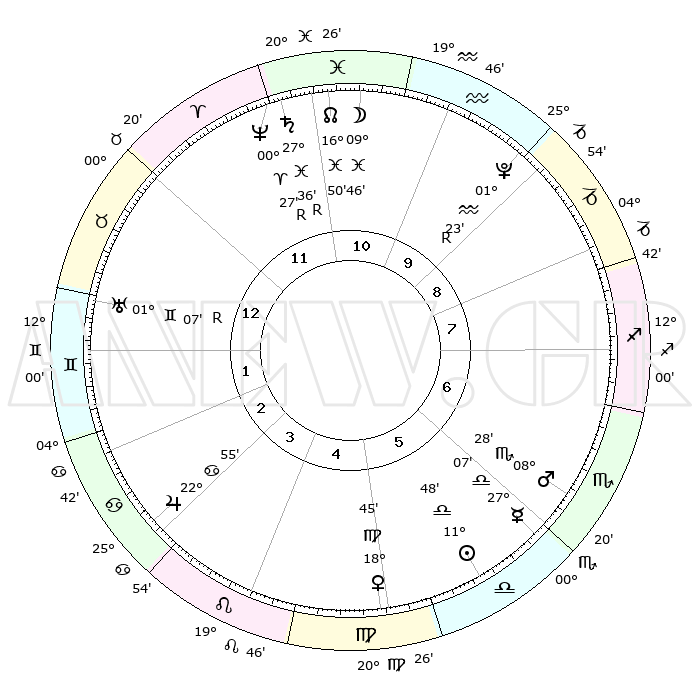 | ΘΕΣΕΙΣ ΠΛΑΝΗΤΩΝ ΑΣΤΡΟΛΟΓΙΚΟΥ ΧΑΡΤΗ ΤΗΣ ΣΤΙΓΜΗΣ ΑΥΤΗΣ | | Πλανήτης | Ζώδιο | Μοίρες | Δεκαήμ. | Σε οίκο | Απόκλιση | | Ακμές των οίκων | Ηλιος | Ζυγός | 11°42' | Δεύτερο | 6 | 04 S 37 | | 1ος | 18°41' | Κριός | Σελήνη | Ιχθείς | 08°11' | Πρώτο | 12 | 09 S 21 | | 2ος | 24°03' | Ταύρος | Ερμής | Ζυγός | 26°57' | Τρίτο | 7 | 10 S 53 | | 3ος | 18°53' | Δίδυμοι | Αφροδίτη | Παρθένος | 18°37' | Δεύτερο | 6 | 05 N 46 | | 4ος | 10°38' | Καρκίνος | Αρης | Σκορπιός | 08°23' | Πρώτο | 7 | 14 S 24 | | 5ος | 04°03' | Λέων | Δίας | Καρκίνος | 22°54' | Τρίτο | 4 | 21 N 31 | | 6ος | 04°36' | Παρθένος | Κρόνος | Ιχθείς | 27°37'R | Τρίτο | 12 | 03 S 15 | | 7ος | 18°41' | Ζυγός | Ουρανός | Δίδυμοι | 01°08'R | Πρώτο | 2 | 20 N 10 | | 8ος | 24°03' | Σκορπιός | Ποσειδώνας | Κριός | 00°27'R | Πρώτο | 12 | 01 S 05 | | 9ος | 18°53' | Τοξότης | Πλούτωνας | Υδροχόος | 01°23'R | Πρώτο | 10 | 23 S 32 | | 10ος | 10°38' | Αιγόκερως | Β. Δεσμός | Ιχθείς | 16°51' | Δεύτερο | 12 | 05 S 12 | | 11ος | 04°03' | Υδροχόος | Ωροσκόπος | Κριός | 18°41' | Δεύτερο | | | 12ος | 04°36' | Ιχθείς | Μεσουράνημα | Αιγόκερως | 10°38' | Δεύτερο | | | |