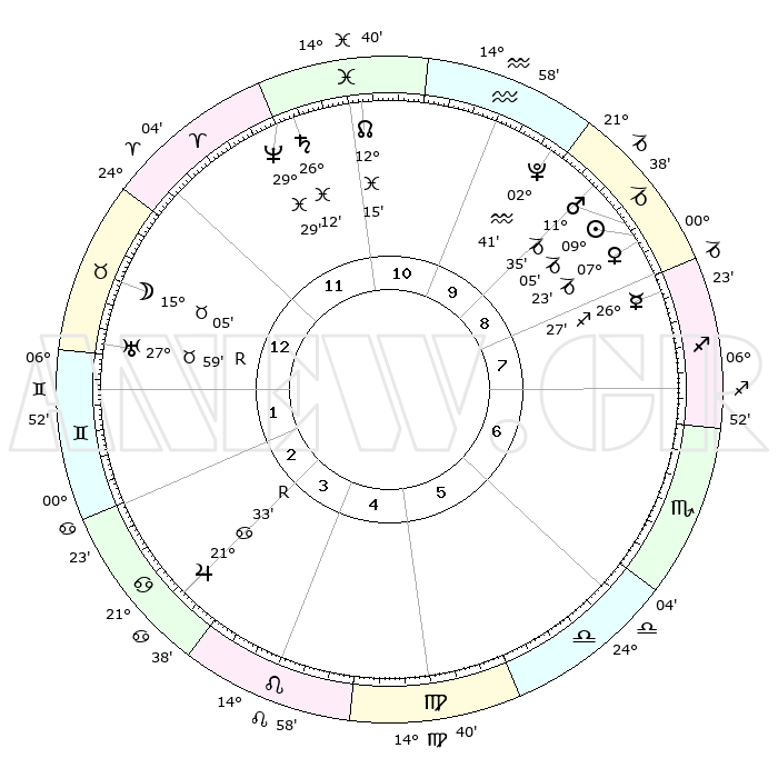 | | ΘΕΣΕΙΣ ΠΛΑΝΗΤΩΝ ΑΣΤΡΟΛΟΓΙΚΟΥ ΧΑΡΤΗ ΤΗΣ ΣΤΙΓΜΗΣ ΑΥΤΗΣ | | | | Πλανήτης | Ζώδιο | Μοίρες | Δεκαήμ. | Σε οίκο | Απόκλιση | | Ακμές των οίκων | | Ηλιος | Αιγόκερως | 09°01' | Πρώτο | 9 | 23 S 08 | | 1ος | 03°57' | Ταύρος | | Σελήνη | Ταύρος | 14°02' | Δεύτερο | 1 | 20 N 21 | | 2ος | 05°06' | Δίδυμοι | | Ερμής | Τοξότης | 26°20' | Τρίτο | 8 | 23 S 47 | | 3ος | 28°16' | Δίδυμοι | | Αφροδίτη | Αιγόκερως | 07°17' | Πρώτο | 9 | 23 S 41 | | 4ος | 19°59' | Καρκίνος | | Αρης | Αιγόκερως | 11°31' | Δεύτερο | 9 | 23 S 49 | | 5ος | 14°47' | Λέων | | Δίας | Καρκίνος | 21°33'R | Τρίτο | 4 | 21 N 56 | | 6ος | 18°17' | Παρθένος | | Κρόνος | Ιχθείς | 26°12' | Τρίτο | 12 | 03 S 35 | | 7ος | 03°57' | Σκορπιός | | Ουρανός | Ταύρος | 27°59'R | Τρίτο | 1 | 19 N 31 | | 8ος | 05°06' | Τοξότης | | Ποσειδώνας | Ιχθείς | 29°29' | Τρίτο | 12 | 01 S 26 | | 9ος | 28°16' | Τοξότης | | Πλούτωνας | Υδροχόος | 02°41' | Πρώτο | 10 | 23 S 14 | | 10ος | 19°59' | Αιγόκερως | | Β. Δεσμός | Ιχθείς | 12°15' | Δεύτερο | 11 | 06 S 58 | | 11ος | 14°47' | Υδροχόος | | Ωροσκόπος | Ταύρος | 03°57' | Πρώτο | | | 12ος | 18°17' | Ιχθείς | | Μεσουράνημα | Αιγόκερως | 19°59' | Δεύτερο | | | |
