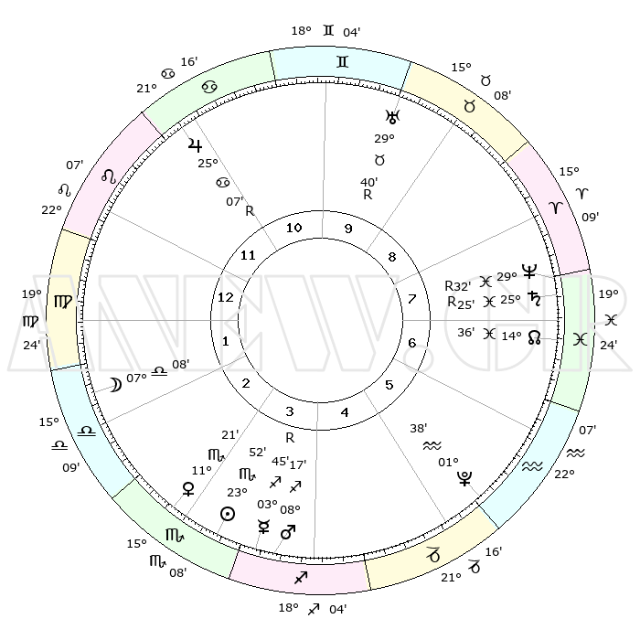 | | ΘΕΣΕΙΣ ΠΛΑΝΗΤΩΝ ΑΣΤΡΟΛΟΓΙΚΟΥ ΧΑΡΤΗ ΤΗΣ ΣΤΙΓΜΗΣ ΑΥΤΗΣ | | | | Πλανήτης | Ζώδιο | Μοίρες | Δεκαήμ. | Σε οίκο | Απόκλιση | | Ακμές των οίκων | | Ηλιος | Σκορπιός | 23°49' | Τρίτο | 3 | 18 S 43 | | 1ος | 02°31' | Παρθένος | | Σελήνη | Ζυγός | 06°26' | Πρώτο | 2 | 04 S 10 | | 2ος | 26°38' | Παρθένος | | Ερμής | Τοξότης | 03°49'R | Πρώτο | 4 | 21 S 50 | | 3ος | 25°31' | Ζυγός | | Αφροδίτη | Σκορπιός | 11°17' | Δεύτερο | 3 | 14 S 05 | | 4ος | 28°28' | Σκορπιός | | Αρης | Τοξότης | 08°14' | Πρώτο | 4 | 22 S 12 | | 5ος | 02°29' | Αιγόκερως | | Δίας | Καρκίνος | 25°07'R | Τρίτο | 11 | 21 N 13 | | 6ος | 04°15' | Υδροχόος | | Κρόνος | Ιχθείς | 25°25'R | Τρίτο | 7 | 04 S 03 | | 7ος | 02°31' | Ιχθείς | | Ουρανός | Ταύρος | 29°40'R | Τρίτο | 10 | 19 N 52 | | 8ος | 26°38' | Ιχθείς | | Ποσειδώνας | Ιχθείς | 29°32'R | Τρίτο | 8 | 01 S 26 | | 9ος | 25°31' | Κριός | | Πλούτωνας | Υδροχόος | 01°38' | Πρώτο | 5 | 23 S 28 | | 10ος | 28°28' | Ταύρος | | Β. Δεσμός | Ιχθείς | 14°36' | Δεύτερο | 7 | 06 S 04 | | 11ος | 02°29' | Καρκίνος | | Ωροσκόπος | Παρθένος | 02°31' | Πρώτο | | | 12ος | 04°15' | Λέων | | Μεσουράνημα | Ταύρος | 28°28' | Τρίτο | | | |