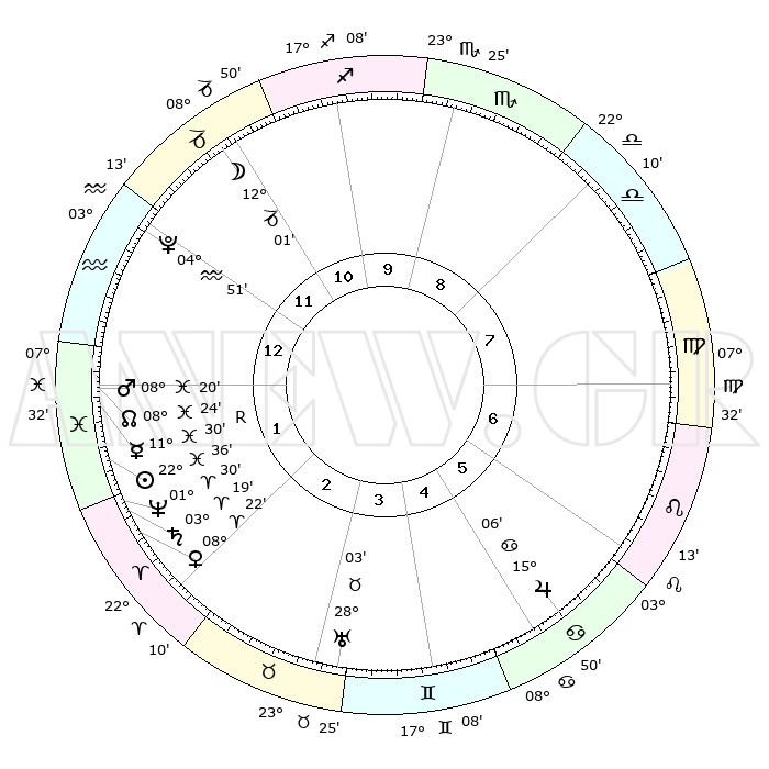 | | ΘΕΣΕΙΣ ΠΛΑΝΗΤΩΝ ΑΣΤΡΟΛΟΓΙΚΟΥ ΧΑΡΤΗ ΤΗΣ ΣΤΙΓΜΗΣ ΑΥΤΗΣ | | | | Πλανήτης | Ζώδιο | Μοίρες | Δεκαήμ. | Σε οίκο | Απόκλιση | | Ακμές των οίκων | | Ηλιος | Ιχθείς | 22°32' | Τρίτο | 1 | 02 S 58 | | 1ος | 09°23' | Υδροχόος | | Σελήνη | Αιγόκερως | 11°21' | Δεύτερο | 11 | 27 S 23 | | 2ος | 24°42' | Ιχθείς | | Ερμής | Ιχθείς | 11°32'R | Δεύτερο | 1 | 04 S 37 | | 3ος | 01°30' | Ταύρος | | Αφροδίτη | Κριός | 08°18' | Πρώτο | 2 | 02 N 17 | | 4ος | 28°27' | Ταύρος | | Αρης | Ιχθείς | 08°18' | Πρώτο | 1 | 09 S 28 | | 5ος | 20°39' | Δίδυμοι | | Δίας | Καρκίνος | 15°06' | Δεύτερο | 6 | 22 N 56 | | 6ος | 12°31' | Καρκίνος | | Κρόνος | Κριός | 03°19' | Πρώτο | 2 | 00 S 38 | | 7ος | 09°23' | Λέων | | Ουρανός | Ταύρος | 28°03' | Τρίτο | 3 | 19 N 33 | | 8ος | 24°42' | Παρθένος | | Ποσειδώνας | Κριός | 01°30' | Πρώτο | 2 | 00 S 36 | | 9ος | 01°30' | Σκορπιός | | Πλούτωνας | Υδροχόος | 04°51' | Πρώτο | 12 | 22 S 50 | | 10ος | 28°27' | Σκορπιός | | Β. Δεσμός | Ιχθείς | 08°24' | Πρώτο | 1 | 08 S 25 | | 11ος | 20°39' | Τοξότης | | Ωροσκόπος | Υδροχόος | 09°23' | Πρώτο | | | 12ος | 12°31' | Αιγόκερως | | Μεσουράνημα | Σκορπιός | 28°27' | Τρίτο | | | |