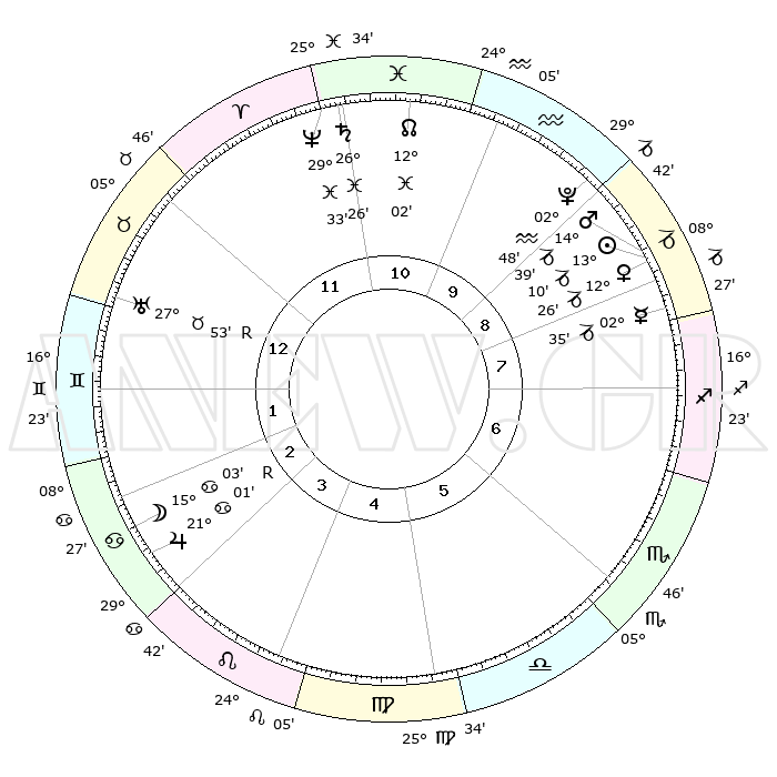 | | ΘΕΣΕΙΣ ΠΛΑΝΗΤΩΝ ΑΣΤΡΟΛΟΓΙΚΟΥ ΧΑΡΤΗ ΤΗΣ ΣΤΙΓΜΗΣ ΑΥΤΗΣ | | | | Πλανήτης | Ζώδιο | Μοίρες | Δεκαήμ. | Σε οίκο | Απόκλιση | | Ακμές των οίκων | | Ηλιος | Αιγόκερως | 12°54' | Δεύτερο | 12 | 22 S 48 | | 1ος | 01°50' | Υδροχόος | | Σελήνη | Καρκίνος | 11°05' | Δεύτερο | 6 | 27 N 20 | | 2ος | 16°14' | Ιχθείς | | Ερμής | Αιγόκερως | 02°10' | Πρώτο | 11 | 24 S 14 | | 3ος | 24°23' | Κριός | | Αφροδίτη | Αιγόκερως | 12°06' | Δεύτερο | 12 | 23 S 28 | | 4ος | 22°32' | Ταύρος | | Αρης | Αιγόκερως | 14°27' | Δεύτερο | 12 | 23 S 33 | | 5ος | 15°10' | Δίδυμοι | | Δίας | Καρκίνος | 21°03'R | Τρίτο | 6 | 22 N 02 | | 6ος | 06°39' | Καρκίνος | | Κρόνος | Ιχθείς | 26°25' | Τρίτο | 2 | 03 S 29 | | 7ος | 01°50' | Λέων | | Ουρανός | Ταύρος | 27°53'R | Τρίτο | 4 | 19 N 29 | | 8ος | 16°14' | Παρθένος | | Ποσειδώνας | Ιχθείς | 29°32' | Τρίτο | 2 | 01 S 24 | | 9ος | 24°23' | Ζυγός | | Πλούτωνας | Υδροχόος | 02°48' | Πρώτο | 1 | 23 S 12 | | 10ος | 22°32' | Σκορπιός | | Β. Δεσμός | Ιχθείς | 12°03' | Δεύτερο | 1 | 07 S 02 | | 11ος | 15°10' | Τοξότης | | Ωροσκόπος | Υδροχόος | 01°50' | Πρώτο | | | 12ος | 06°39' | Αιγόκερως | | Μεσουράνημα | Σκορπιός | 22°32' | Τρίτο | | | |