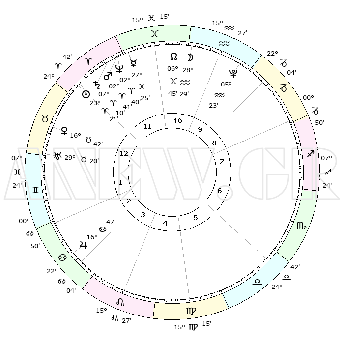 | | ΘΕΣΕΙΣ ΠΛΑΝΗΤΩΝ ΑΣΤΡΟΛΟΓΙΚΟΥ ΧΑΡΤΗ ΤΗΣ ΣΤΙΓΜΗΣ ΑΥΤΗΣ | | | | Πλανήτης | Ζώδιο | Μοίρες | Δεκαήμ. | Σε οίκο | Απόκλιση | | Ακμές των οίκων | | Ηλιος | Κριός | 23°16' | Τρίτο | 12 | 09 N 02 | | 1ος | 05°01' | Ταύρος | | Σελήνη | Υδροχόος | 27°34' | Τρίτο | 11 | 13 S 12 | | 2ος | 05°52' | Δίδυμοι | | Ερμής | Ιχθείς | 27°19' | Τρίτο | 12 | 03 S 23 | | 3ος | 28°56' | Δίδυμοι | | Αφροδίτη | Ταύρος | 16°37' | Δεύτερο | 1 | 16 N 53 | | 4ος | 20°40' | Καρκίνος | | Αρης | Κριός | 02°38' | Πρώτο | 12 | 00 N 08 | | 5ος | 15°35' | Λέων | | Δίας | Καρκίνος | 16°47' | Δεύτερο | 3 | 22 N 45 | | 6ος | 19°18' | Παρθένος | | Κρόνος | Κριός | 07°10' | Πρώτο | 12 | 00 N 53 | | 7ος | 05°01' | Σκορπιός | | Ουρανός | Ταύρος | 29°20' | Τρίτο | 1 | 19 N 50 | | 8ος | 05°52' | Τοξότης | | Ποσειδώνας | Κριός | 02°40' | Πρώτο | 12 | 00 S 09 | | 9ος | 28°56' | Τοξότης | | Πλούτωνας | Υδροχόος | 05°23' | Πρώτο | 10 | 22 S 47 | | 10ος | 20°40' | Αιγόκερως | | Β. Δεσμός | Ιχθείς | 06°45' | Πρώτο | 11 | 09 S 02 | | 11ος | 15°35' | Υδροχόος | | Ωροσκόπος | Ταύρος | 05°01' | Πρώτο | | | 12ος | 19°18' | Ιχθείς | | Μεσουράνημα | Αιγόκερως | 20°40' | Τρίτο | | | |