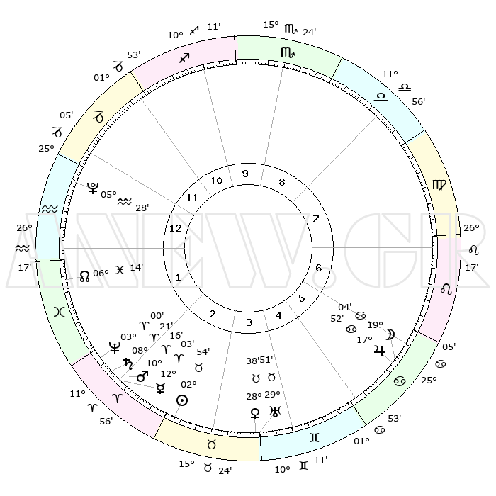 | | ΘΕΣΕΙΣ ΠΛΑΝΗΤΩΝ ΑΣΤΡΟΛΟΓΙΚΟΥ ΧΑΡΤΗ ΤΗΣ ΣΤΙΓΜΗΣ ΑΥΤΗΣ | | | | Πλανήτης | Ζώδιο | Μοίρες | Δεκαήμ. | Σε οίκο | Απόκλιση | | Ακμές των οίκων | | Ηλιος | Ταύρος | 02°50' | Πρώτο | 3 | 12 N 27 | | 1ος | 25°34' | Αιγόκερως | | Σελήνη | Καρκίνος | 18°08' | Δεύτερο | 6 | 26 N 02 | | 2ος | 08°52' | Ιχθείς | | Ερμής | Κριός | 11°56' | Δεύτερο | 2 | 02 N 23 | | 3ος | 17°57' | Κριός | | Αφροδίτη | Ταύρος | 28°33' | Τρίτο | 4 | 20 N 21 | | 4ος | 17°12' | Ταύρος | | Αρης | Κριός | 10°13' | Δεύτερο | 2 | 03 N 11 | | 5ος | 10°19' | Δίδυμοι | | Δίας | Καρκίνος | 17°52' | Δεύτερο | 6 | 22 N 37 | | 6ος | 01°36' | Καρκίνος | | Κρόνος | Κριός | 08°20' | Πρώτο | 2 | 01 N 19 | | 7ος | 25°34' | Καρκίνος | | Ουρανός | Ταύρος | 29°50' | Τρίτο | 4 | 19 N 57 | | 8ος | 08°52' | Παρθένος | | Ποσειδώνας | Κριός | 03°00' | Πρώτο | 2 | 00 S 01 | | 9ος | 17°57' | Ζυγός | | Πλούτωνας | Υδροχόος | 05°28' | Πρώτο | 1 | 22 S 48 | | 10ος | 17°12' | Σκορπιός | | Β. Δεσμός | Ιχθείς | 06°14' | Πρώτο | 1 | 09 S 13 | | 11ος | 10°19' | Τοξότης | | Ωροσκόπος | Αιγόκερως | 25°34' | Τρίτο | | | 12ος | 01°36' | Αιγόκερως | | Μεσουράνημα | Σκορπιός | 17°12' | Δεύτερο | | | |