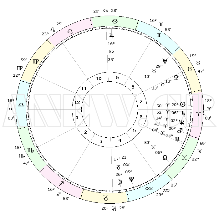 | | ΘΕΣΕΙΣ ΠΛΑΝΗΤΩΝ ΑΣΤΡΟΛΟΓΙΚΟΥ ΧΑΡΤΗ ΤΗΣ ΣΤΙΓΜΗΣ ΑΥΤΗΣ | | | | Πλανήτης | Ζώδιο | Μοίρες | Δεκαήμ. | Σε οίκο | Απόκλιση | | Ακμές των οίκων | | Ηλιος | Κριός | 20°46' | Τρίτο | 7 | 08 N 06 | | 1ος | 28°38' | Παρθένος | | Σελήνη | Αιγόκερως | 25°29' | Τρίτο | 4 | 24 S 29 | | 2ος | 25°07' | Ζυγός | | Ερμής | Ιχθείς | 23°59' | Τρίτο | 6 | 04 S 35 | | 3ος | 25°30' | Σκορπιός | | Αφροδίτη | Ταύρος | 13°29' | Δεύτερο | 8 | 15 N 51 | | 4ος | 28°27' | Τοξότης | | Αρης | Κριός | 00°38' | Πρώτο | 7 | 00 S 40 | | 5ος | 01°27' | Υδροχόος | | Δίας | Καρκίνος | 16°32' | Δεύτερο | 10 | 22 N 47 | | 6ος | 01°56' | Ιχθείς | | Κρόνος | Κριός | 06°51' | Πρώτο | 7 | 00 N 45 | | 7ος | 28°38' | Ιχθείς | | Ουρανός | Ταύρος | 29°12' | Τρίτο | 9 | 19 N 49 | | 8ος | 25°07' | Κριός | | Ποσειδώνας | Κριός | 02°34' | Πρώτο | 7 | 00 S 11 | | 9ος | 25°30' | Ταύρος | | Πλούτωνας | Υδροχόος | 05°21' | Πρώτο | 5 | 22 S 47 | | 10ος | 28°27' | Δίδυμοι | | Β. Δεσμός | Ιχθείς | 06°54' | Πρώτο | 6 | 08 S 59 | | 11ος | 01°27' | Λέων | | Ωροσκόπος | Παρθένος | 28°38' | Τρίτο | | | 12ος | 01°56' | Παρθένος | | Μεσουράνημα | Δίδυμοι | 28°27' | Τρίτο | | | |