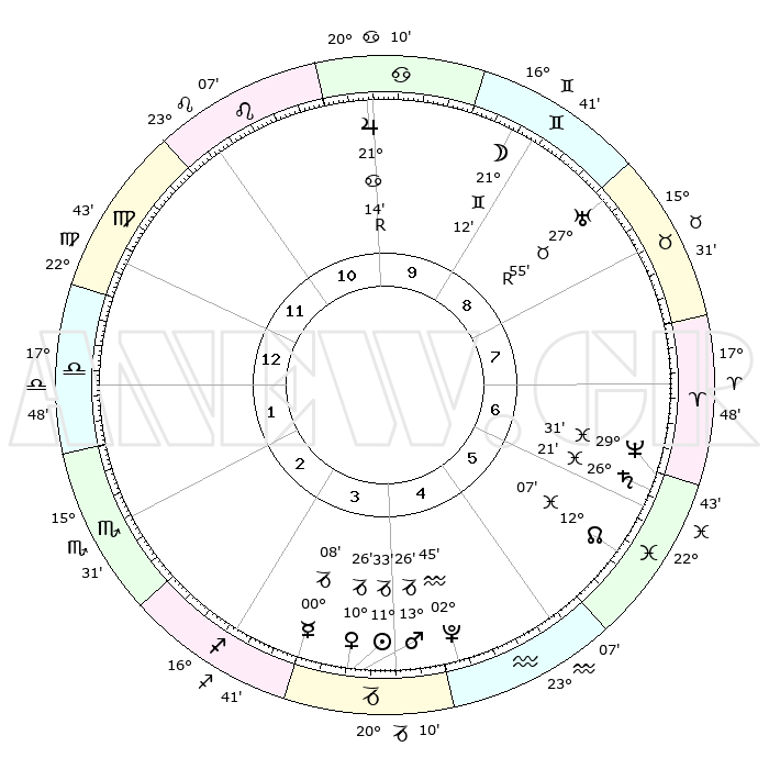 | | ΘΕΣΕΙΣ ΠΛΑΝΗΤΩΝ ΑΣΤΡΟΛΟΓΙΚΟΥ ΧΑΡΤΗ ΤΗΣ ΣΤΙΓΜΗΣ ΑΥΤΗΣ | | | | Πλανήτης | Ζώδιο | Μοίρες | Δεκαήμ. | Σε οίκο | Απόκλιση | | Ακμές των οίκων | | Ηλιος | Αιγόκερως | 11°29' | Δεύτερο | 4 | 22 S 56 | | 1ος | 28°22' | Παρθένος | | Σελήνη | Δίδυμοι | 20°12' | Τρίτο | 9 | 28 N 03 | | 2ος | 24°50' | Ζυγός | | Ερμής | Αιγόκερως | 00°02' | Πρώτο | 4 | 24 S 06 | | 3ος | 25°13' | Σκορπιός | | Αφροδίτη | Αιγόκερως | 10°21' | Δεύτερο | 4 | 23 S 34 | | 4ος | 28°10' | Τοξότης | | Αρης | Αιγόκερως | 13°23' | Δεύτερο | 4 | 23 S 39 | | 5ος | 01°10' | Υδροχόος | | Δίας | Καρκίνος | 21°14'R | Τρίτο | 10 | 22 N 00 | | 6ος | 01°40' | Ιχθείς | | Κρόνος | Ιχθείς | 26°20' | Τρίτο | 6 | 03 S 32 | | 7ος | 28°22' | Ιχθείς | | Ουρανός | Ταύρος | 27°55'R | Τρίτο | 9 | 19 N 30 | | 8ος | 24°50' | Κριός | | Ποσειδώνας | Ιχθείς | 29°31' | Τρίτο | 7 | 01 S 25 | | 9ος | 25°13' | Ταύρος | | Πλούτωνας | Υδροχόος | 02°45' | Πρώτο | 5 | 23 S 13 | | 10ος | 28°10' | Δίδυμοι | | Β. Δεσμός | Ιχθείς | 12°07' | Δεύτερο | 6 | 07 S 01 | | 11ος | 01°10' | Λέων | | Ωροσκόπος | Παρθένος | 28°22' | Τρίτο | | | 12ος | 01°40' | Παρθένος | | Μεσουράνημα | Δίδυμοι | 28°10' | Τρίτο | | | |