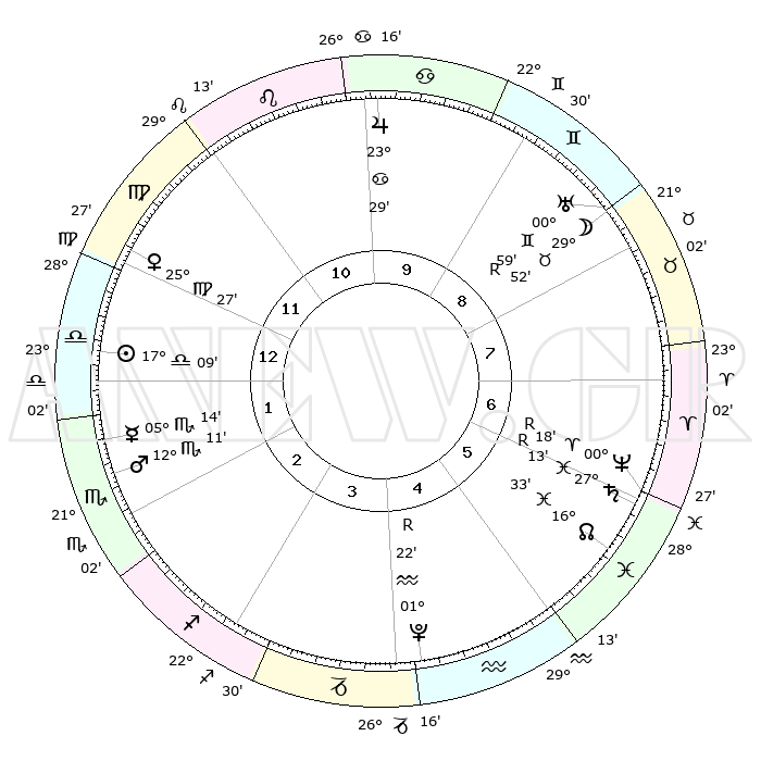 | ΘΕΣΕΙΣ ΠΛΑΝΗΤΩΝ ΑΣΤΡΟΛΟΓΙΚΟΥ ΧΑΡΤΗ ΤΗΣ ΣΤΙΓΜΗΣ ΑΥΤΗΣ | | Πλανήτης | Ζώδιο | Μοίρες | Δεκαήμ. | Σε οίκο | Απόκλιση | | Ακμές των οίκων | Ηλιος | Ζυγός | 16°49' | Δεύτερο | 4 | 06 S 36 | | 1ος | 12°18' | Καρκίνος | Σελήνη | Ταύρος | 24°45' | Τρίτο | 11 | 23 N 35 | | 2ος | 02°43' | Λέων | Ερμής | Σκορπιός | 04°44' | Πρώτο | 5 | 14 S 11 | | 3ος | 25°35' | Λέων | Αφροδίτη | Παρθένος | 25°02' | Τρίτο | 4 | 03 N 19 | | 4ος | 23°56' | Παρθένος | Αρης | Σκορπιός | 11°57' | Δεύτερο | 5 | 15 S 35 | | 5ος | 29°26' | Ζυγός | Δίας | Καρκίνος | 23°27' | Τρίτο | 1 | 21 N 26 | | 6ος | 08°03' | Τοξότης | Κρόνος | Ιχθείς | 27°14'R | Τρίτο | 10 | 03 S 24 | | 7ος | 12°18' | Αιγόκερως | Ουρανός | Δίδυμοι | 00°60'R | Πρώτο | 11 | 20 N 09 | | 8ος | 02°43' | Υδροχόος | Ποσειδώνας | Κριός | 00°18'R | Πρώτο | 10 | 01 S 08 | | 9ος | 25°35' | Υδροχόος | Πλούτωνας | Υδροχόος | 01°22'R | Πρώτο | 7 | 23 S 32 | | 10ος | 23°56' | Ιχθείς | Β. Δεσμός | Ιχθείς | 16°34' | Δεύτερο | 9 | 05 S 18 | | 11ος | 29°26' | Κριός | Ωροσκόπος | Καρκίνος | 12°18' | Δεύτερο | | | 12ος | 08°03' | Δίδυμοι | Μεσουράνημα | Ιχθείς | 23°56' | Τρίτο | | | |