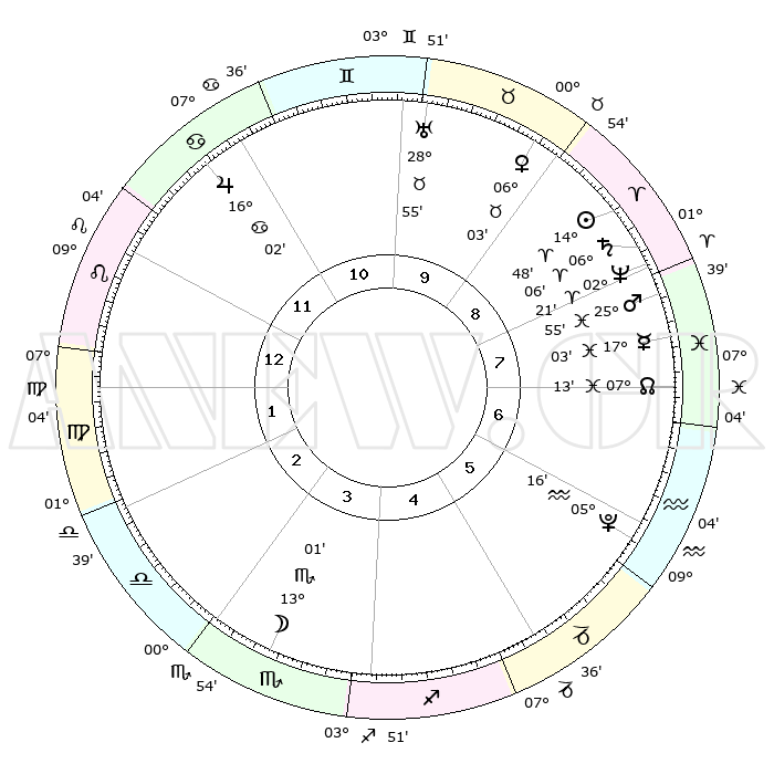 | | ΘΕΣΕΙΣ ΠΛΑΝΗΤΩΝ ΑΣΤΡΟΛΟΓΙΚΟΥ ΧΑΡΤΗ ΤΗΣ ΣΤΙΓΜΗΣ ΑΥΤΗΣ | | | | Πλανήτης | Ζώδιο | Μοίρες | Δεκαήμ. | Σε οίκο | Απόκλιση | | Ακμές των οίκων | | Ηλιος | Κριός | 14°44' | Δεύτερο | 9 | 05 N 48 | | 1ος | 17°05' | Λέων | | Σελήνη | Σκορπιός | 12°11' | Δεύτερο | 4 | 19 S 54 | | 2ος | 09°36' | Παρθένος | | Ερμής | Ιχθείς | 16°59' | Δεύτερο | 8 | 06 S 48 | | 3ος | 06°54' | Ζυγός | | Αφροδίτη | Ταύρος | 05°58' | Πρώτο | 9 | 13 N 14 | | 4ος | 09°26' | Σκορπιός | | Αρης | Ιχθείς | 25°52' | Τρίτο | 8 | 02 S 35 | | 5ος | 14°33' | Τοξότης | | Δίας | Καρκίνος | 16°02' | Δεύτερο | 11 | 22 N 51 | | 6ος | 17°47' | Αιγόκερως | | Κρόνος | Κριός | 06°06' | Πρώτο | 8 | 00 N 28 | | 7ος | 17°05' | Υδροχόος | | Ουρανός | Ταύρος | 28°55' | Τρίτο | 10 | 19 N 45 | | 8ος | 09°36' | Ιχθείς | | Ποσειδώνας | Κριός | 02°20' | Πρώτο | 8 | 00 S 16 | | 9ος | 06°54' | Κριός | | Πλούτωνας | Υδροχόος | 05°16' | Πρώτο | 6 | 22 S 47 | | 10ος | 09°26' | Ταύρος | | Β. Δεσμός | Ιχθείς | 07°13' | Πρώτο | 7 | 08 S 51 | | 11ος | 14°33' | Δίδυμοι | | Ωροσκόπος | Λέων | 17°05' | Δεύτερο | | | 12ος | 17°47' | Καρκίνος | | Μεσουράνημα | Ταύρος | 09°26' | Πρώτο | | | |