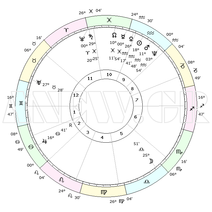 | | ΘΕΣΕΙΣ ΠΛΑΝΗΤΩΝ ΑΣΤΡΟΛΟΓΙΚΟΥ ΧΑΡΤΗ ΤΗΣ ΣΤΙΓΜΗΣ ΑΥΤΗΣ | | | | Πλανήτης | Ζώδιο | Μοίρες | Δεκαήμ. | Σε οίκο | Απόκλιση | | Ακμές των οίκων | | Ηλιος | Υδροχόος | 18°37' | Δεύτερο | 10 | 15 S 15 | | 1ος | 19°15' | Ταύρος | | Σελήνη | Ζυγός | 25°02' | Τρίτο | 6 | 13 S 12 | | 2ος | 16°27' | Δίδυμοι | | Ερμής | Ιχθείς | 00°47' | Πρώτο | 11 | 12 S 23 | | 3ος | 08°24' | Καρκίνος | | Αφροδίτη | Υδροχόος | 26°12' | Τρίτο | 10 | 14 S 08 | | 4ος | 00°32' | Λέων | | Αρης | Υδροχόος | 11°45' | Δεύτερο | 10 | 18 S 17 | | 5ος | 27°17' | Λέων | | Δίας | Καρκίνος | 16°41'R | Δεύτερο | 3 | 22 N 42 | | 6ος | 03°49' | Ζυγός | | Κρόνος | Ιχθείς | 29°24' | Τρίτο | 11 | 02 S 13 | | 7ος | 19°15' | Σκορπιός | | Ουρανός | Ταύρος | 27°28' | Τρίτο | 1 | 19 N 24 | | 8ος | 16°27' | Τοξότης | | Ποσειδώνας | Κριός | 00°20' | Πρώτο | 11 | 01 S 04 | | 9ος | 08°24' | Αιγόκερως | | Πλούτωνας | Υδροχόος | 03°54' | Πρώτο | 10 | 22 S 59 | | 10ος | 00°32' | Υδροχόος | | Β. Δεσμός | Ιχθείς | 10°11' | Δεύτερο | 11 | 07 S 45 | | 11ος | 27°16' | Υδροχόος | | Ωροσκόπος | Ταύρος | 19°15' | Δεύτερο | | | 12ος | 03°49' | Κριός | | Μεσουράνημα | Υδροχόος | 00°32' | Πρώτο | | | |