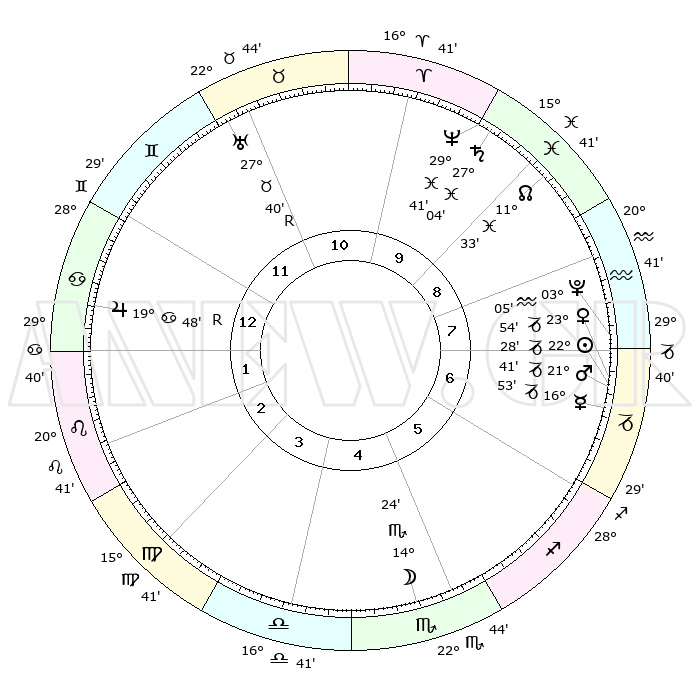 | | ΘΕΣΕΙΣ ΠΛΑΝΗΤΩΝ ΑΣΤΡΟΛΟΓΙΚΟΥ ΧΑΡΤΗ ΤΗΣ ΣΤΙΓΜΗΣ ΑΥΤΗΣ | | | | Πλανήτης | Ζώδιο | Μοίρες | Δεκαήμ. | Σε οίκο | Απόκλιση | | Ακμές των οίκων | | Ηλιος | Αιγόκερως | 22°21' | Τρίτο | 8 | 21 S 35 | | 1ος | 23°54' | Δίδυμοι | | Σελήνη | Σκορπιός | 13°03' | Δεύτερο | 5 | 20 S 06 | | 2ος | 15°09' | Καρκίνος | | Ερμής | Αιγόκερως | 16°42' | Δεύτερο | 8 | 24 S 00 | | 3ος | 06°38' | Λέων | | Αφροδίτη | Αιγόκερως | 23°45' | Τρίτο | 8 | 22 S 14 | | 4ος | 02°01' | Παρθένος | | Αρης | Αιγόκερως | 21°36' | Τρίτο | 8 | 22 S 39 | | 5ος | 04°55' | Ζυγός | | Δίας | Καρκίνος | 19°48'R | Δεύτερο | 2 | 22 N 14 | | 6ος | 15°12' | Σκορπιός | | Κρόνος | Ιχθείς | 27°03' | Τρίτο | 10 | 03 S 13 | | 7ος | 23°54' | Τοξότης | | Ουρανός | Ταύρος | 27°40'R | Τρίτο | 12 | 19 N 27 | | 8ος | 15°09' | Αιγόκερως | | Ποσειδώνας | Ιχθείς | 29°41' | Τρίτο | 10 | 01 S 20 | | 9ος | 06°38' | Υδροχόος | | Πλούτωνας | Υδροχόος | 03°05' | Πρώτο | 8 | 23 S 09 | | 10ος | 02°01' | Ιχθείς | | Β. Δεσμός | Ιχθείς | 11°33' | Δεύτερο | 10 | 07 S 14 | | 11ος | 04°55' | Κριός | | Ωροσκόπος | Δίδυμοι | 23°54' | Τρίτο | | | 12ος | 15°12' | Ταύρος | | Μεσουράνημα | Ιχθείς | 02°01' | Πρώτο | | | |