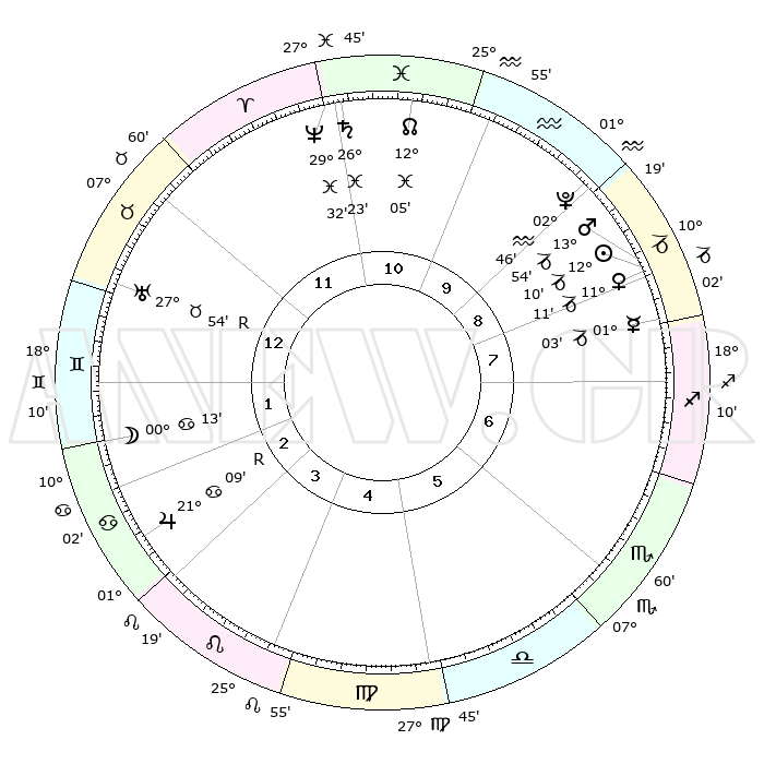 | | ΘΕΣΕΙΣ ΠΛΑΝΗΤΩΝ ΑΣΤΡΟΛΟΓΙΚΟΥ ΧΑΡΤΗ ΤΗΣ ΣΤΙΓΜΗΣ ΑΥΤΗΣ | | | | Πλανήτης | Ζώδιο | Μοίρες | Δεκαήμ. | Σε οίκο | Απόκλιση | | Ακμές των οίκων | | Ηλιος | Αιγόκερως | 12°05' | Δεύτερο | 9 | 22 S 53 | | 1ος | 18°06' | Ταύρος | | Σελήνη | Δίδυμοι | 29°07' | Τρίτο | 2 | 28 N 14 | | 2ος | 15°34' | Δίδυμοι | | Ερμής | Αιγόκερως | 00°57' | Πρώτο | 8 | 24 S 10 | | 3ος | 07°35' | Καρκίνος | | Αφροδίτη | Αιγόκερως | 11°06' | Δεύτερο | 9 | 23 S 32 | | 4ος | 29°40' | Καρκίνος | | Αρης | Αιγόκερως | 13°50' | Δεύτερο | 9 | 23 S 37 | | 5ος | 26°15' | Λέων | | Δίας | Καρκίνος | 21°09'R | Τρίτο | 3 | 22 N 01 | | 6ος | 02°35' | Ζυγός | | Κρόνος | Ιχθείς | 26°23' | Τρίτο | 11 | 03 S 31 | | 7ος | 18°06' | Σκορπιός | | Ουρανός | Ταύρος | 27°54'R | Τρίτο | 1 | 19 N 30 | | 8ος | 15°34' | Τοξότης | | Ποσειδώνας | Ιχθείς | 29°32' | Τρίτο | 11 | 01 S 25 | | 9ος | 07°35' | Αιγόκερως | | Πλούτωνας | Υδροχόος | 02°46' | Πρώτο | 10 | 23 S 13 | | 10ος | 29°40' | Αιγόκερως | | Β. Δεσμός | Ιχθείς | 12°05' | Δεύτερο | 11 | 07 S 01 | | 11ος | 26°15' | Υδροχόος | | Ωροσκόπος | Ταύρος | 18°06' | Δεύτερο | | | 12ος | 02°35' | Κριός | | Μεσουράνημα | Αιγόκερως | 29°40' | Τρίτο | | | |