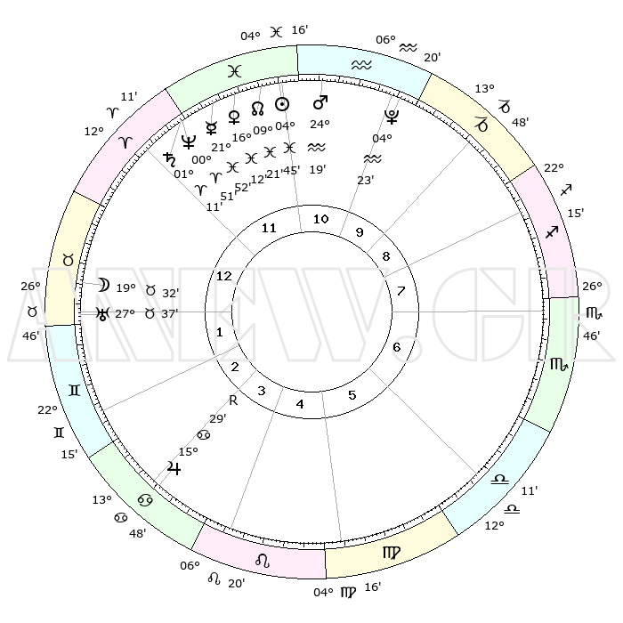| | ΘΕΣΕΙΣ ΠΛΑΝΗΤΩΝ ΑΣΤΡΟΛΟΓΙΚΟΥ ΧΑΡΤΗ ΤΗΣ ΣΤΙΓΜΗΣ ΑΥΤΗΣ | | | | Πλανήτης | Ζώδιο | Μοίρες | Δεκαήμ. | Σε οίκο | Απόκλιση | | Ακμές των οίκων | | Ηλιος | Ιχθείς | 04°41' | Πρώτο | 11 | 09 S 48 | | 1ος | 21°11' | Κριός | | Σελήνη | Ταύρος | 18°32' | Δεύτερο | 1 | 22 N 06 | | 2ος | 25°51' | Ταύρος | | Ερμής | Ιχθείς | 21°50' | Τρίτο | 12 | 01 S 19 | | 3ος | 20°23' | Δίδυμοι | | Αφροδίτη | Ιχθείς | 16°06' | Δεύτερο | 12 | 06 S 48 | | 4ος | 12°06' | Καρκίνος | | Αρης | Υδροχόος | 24°16' | Τρίτο | 11 | 14 S 28 | | 5ος | 05°43' | Λέων | | Δίας | Καρκίνος | 15°30'R | Δεύτερο | 4 | 22 N 52 | | 6ος | 06°43' | Παρθένος | | Κρόνος | Κριός | 01°10' | Πρώτο | 12 | 01 S 30 | | 7ος | 21°11' | Ζυγός | | Ουρανός | Ταύρος | 27°37' | Τρίτο | 2 | 19 N 27 | | 8ος | 25°51' | Σκορπιός | | Ποσειδώνας | Κριός | 00°51' | Πρώτο | 12 | 00 S 52 | | 9ος | 20°23' | Τοξότης | | Πλούτωνας | Υδροχόος | 04°23' | Πρώτο | 10 | 22 S 54 | | 10ος | 12°06' | Αιγόκερως | | Β. Δεσμός | Ιχθείς | 09°21' | Πρώτο | 12 | 08 S 04 | | 11ος | 05°43' | Υδροχόος | | Ωροσκόπος | Κριός | 21°11' | Τρίτο | | | 12ος | 06°44' | Ιχθείς | | Μεσουράνημα | Αιγόκερως | 12°06' | Δεύτερο | | | |