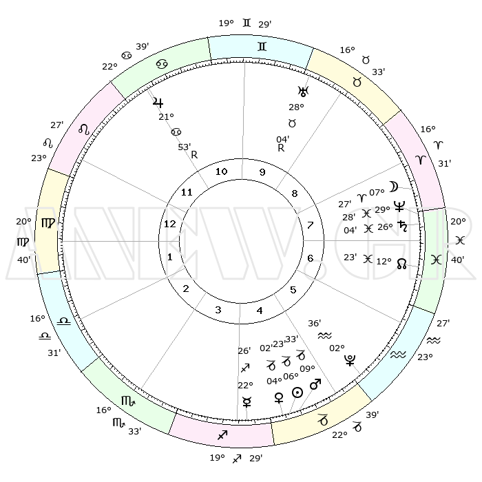 | | ΘΕΣΕΙΣ ΠΛΑΝΗΤΩΝ ΑΣΤΡΟΛΟΓΙΚΟΥ ΧΑΡΤΗ ΤΗΣ ΣΤΙΓΜΗΣ ΑΥΤΗΣ | | | | Πλανήτης | Ζώδιο | Μοίρες | Δεκαήμ. | Σε οίκο | Απόκλιση | | Ακμές των οίκων | | Ηλιος | Αιγόκερως | 06°18' | Πρώτο | 5 | 23 S 17 | | 1ος | 01°07' | Παρθένος | | Σελήνη | Κριός | 06°32' | Πρώτο | 8 | 04 N 35 | | 2ος | 25°06' | Παρθένος | | Ερμής | Τοξότης | 22°20' | Τρίτο | 4 | 23 S 18 | | 3ος | 23°52' | Ζυγός | | Αφροδίτη | Αιγόκερως | 03°57' | Πρώτο | 5 | 23 S 43 | | 4ος | 26°48' | Σκορπιός | | Αρης | Αιγόκερως | 09°30' | Πρώτο | 5 | 23 S 57 | | 5ος | 00°55' | Αιγόκερως | | Δίας | Καρκίνος | 21°53'R | Τρίτο | 11 | 21 N 53 | | 6ος | 02°47' | Υδροχόος | | Κρόνος | Ιχθείς | 26°03' | Τρίτο | 8 | 03 S 39 | | 7ος | 01°07' | Ιχθείς | | Ουρανός | Ταύρος | 28°04'R | Τρίτο | 10 | 19 N 32 | | 8ος | 25°06' | Ιχθείς | | Ποσειδώνας | Ιχθείς | 29°28' | Τρίτο | 8 | 01 S 26 | | 9ος | 23°52' | Κριός | | Πλούτωνας | Υδροχόος | 02°36' | Πρώτο | 5 | 23 S 15 | | 10ος | 26°48' | Ταύρος | | Β. Δεσμός | Ιχθείς | 12°23' | Δεύτερο | 7 | 06 S 55 | | 11ος | 00°55' | Καρκίνος | | Ωροσκόπος | Παρθένος | 01°07' | Πρώτο | | | 12ος | 02°47' | Λέων | | Μεσουράνημα | Ταύρος | 26°48' | Τρίτο | | | |
